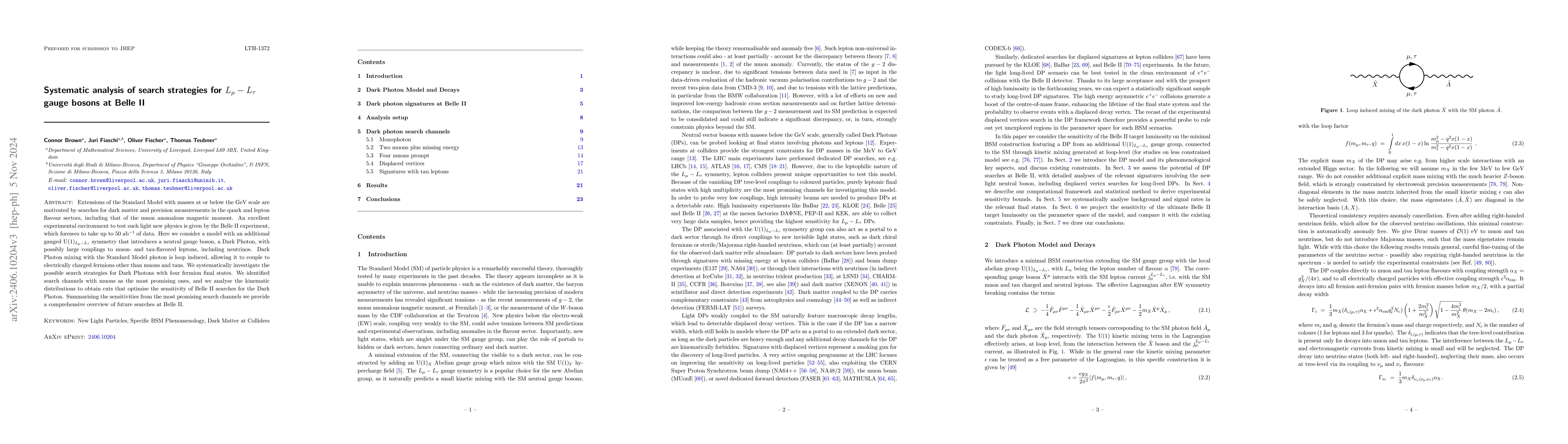 This paper systematically examines search strategies for $L_\mu-L_\tau$ gauge bosons, or Dark Photons, at the Belle II experiment, focusing on models with new gauge symmetries that could explain anomalies in muon magnetic moment and other flavor physics. The authors identify muon-based channels as the most promising for detecting Dark Photons, providing optimized cuts and summarizing future search sensitivities for Belle II.