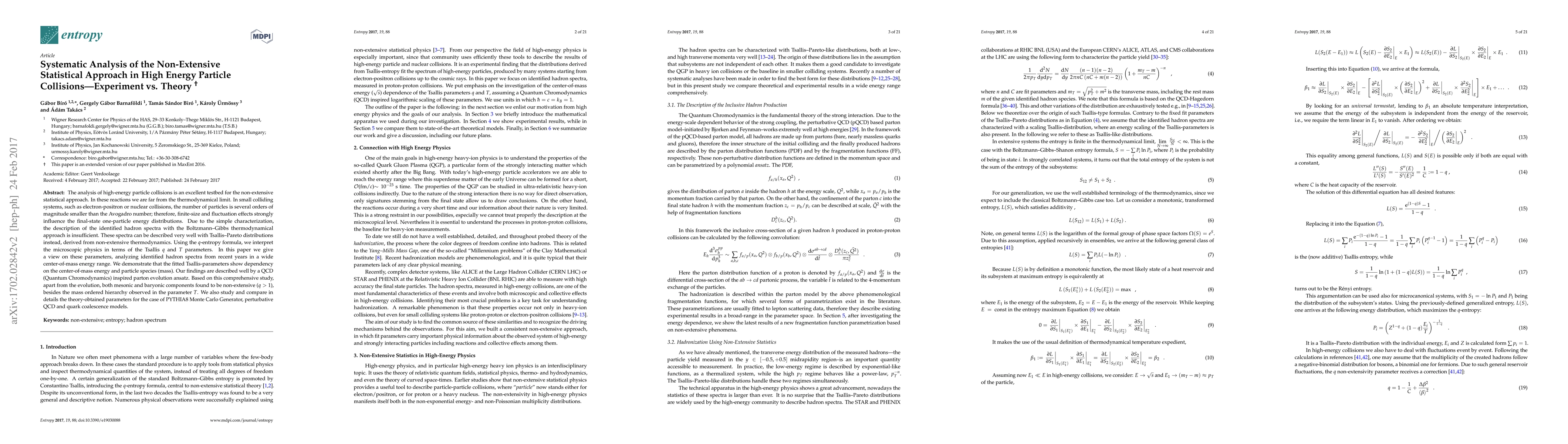 This paper systematically analyzes the non-extensive statistical approach in high-energy particle collisions, showing that Tsallis-Pareto distributions better describe identified hadron spectra than the Boltzmann-Gibbs approach. The study reveals that Tsallis parameters depend on center-of-mass energy and particle species, aligning with QCD-inspired parton evolution models.