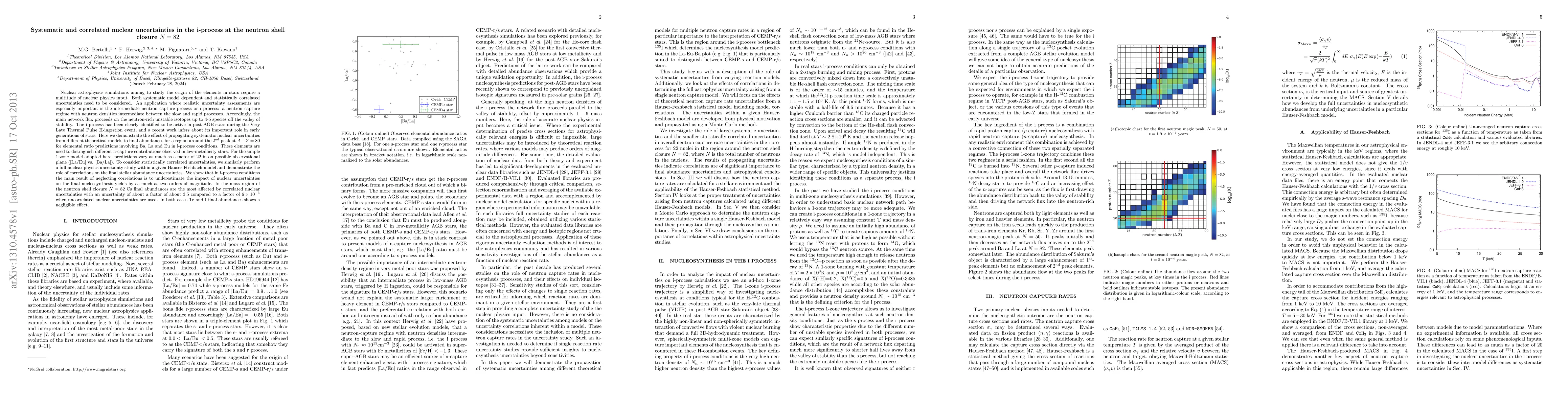 Nuclear astrophysics simulations aiming to study the origin of the elements in stars require a multitude of nuclear physics input. Both systematic model dependent and statistically correlated uncertainties need to be considered. An application where realistic uncertainty assessments are especially important is the intermediate neutron capture process or i process: a neutron capture regime with neutron densities intermediate between the slow and rapid processes. Accordingly, the main network flux proceeds on the neutron-rich unstable isotopes up to 4-5 species off the valley of stability. The i process has been clearly identified to be active in post-AGB stars during the Very Late Thermal Pulse H-ingestion event, and a recent work infers about its important role in early generations of stars. Here we demonstrate the effect of propagating systematic nuclear uncertainties from different theoretical models to final abundances for a region around the 2$^\mathrm{nd}$ peak at $A-Z=80$ for elemental ratio predictions involving Ba, La and Eu in i-process conditions. These elements are used to distinguish different n-capture contributions observed in low-metallicity stars. For the simple 1-zone model adopted here, predictions vary as much as a factor of 22 in on possible observational plane ([La/Eu] vs. [Ba/La]). To consider statistically correlated uncertainties, we similarly perform a full nuclear physics uncertainty study within a given Hauser-Feshbach model and demonstrate the role of correlations on the final stellar abundance uncertainties. We show that in i-process conditions the main result of neglecting correlations is to underestimate the impact of nuclear uncertainties on the final nucleosynthesis yields by as much as two orders of magnitude. (continued in document)