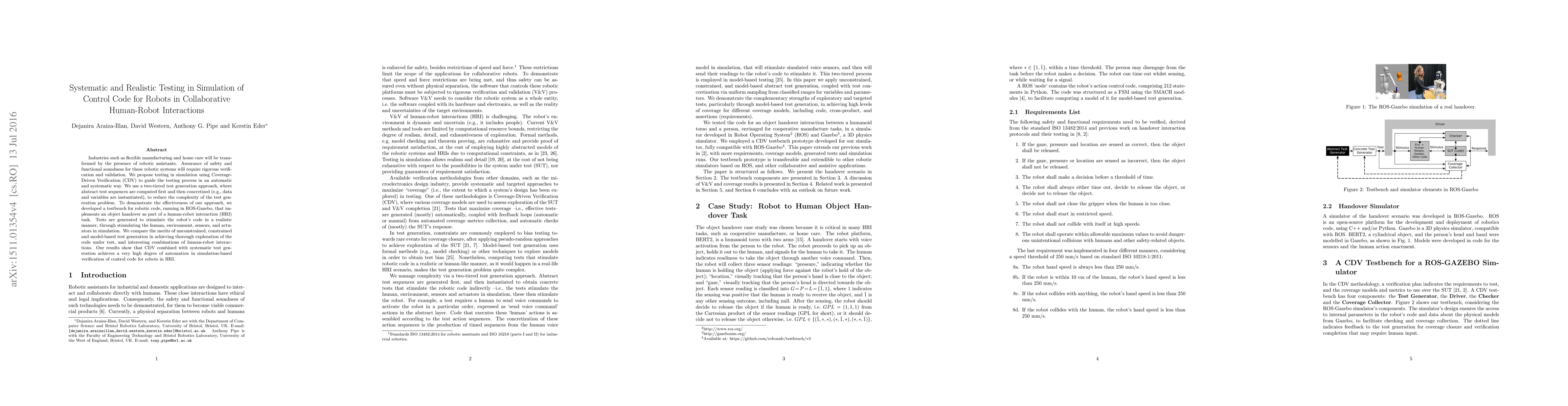 Industries such as flexible manufacturing and home care will be transformed by the presence of robotic assistants. Assurance of safety and functional soundness for these robotic systems will require rigorous verification and validation. We propose testing in simulation using Coverage-Driven Verification (CDV) to guide the testing process in an automatic and systematic way. We use a two-tiered test generation approach, where abstract test sequences are computed first and then concretized (e.g., data and variables are instantiated), to reduce the complexity of the test generation problem. To demonstrate the effectiveness of our approach, we developed a testbench for robotic code, running in ROS-Gazebo, that implements an object handover as part of a human-robot interaction (HRI) task. Tests are generated to stimulate the robot's code in a realistic manner, through stimulating the human, environment, sensors, and actuators in simulation. We compare the merits of unconstrained, constrained and model-based test generation in achieving thorough exploration of the code under test, and interesting combinations of human-robot interactions. Our results show that CDV combined with systematic test generation achieves a very high degree of automation in simulation-based verification of control code for robots in HRI.