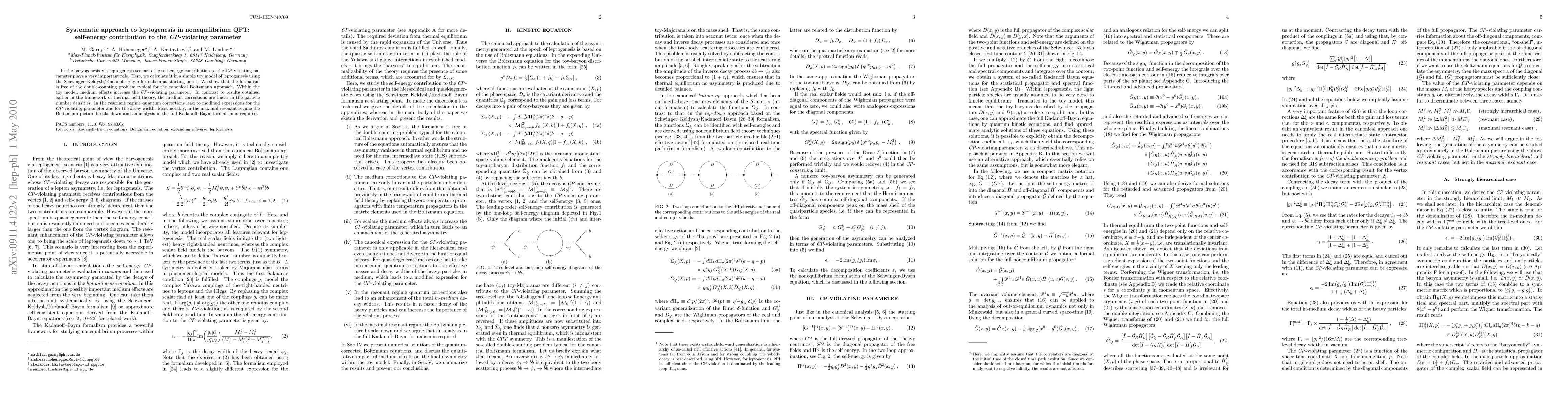 In the baryogenesis via leptogenesis scenario the self-energy contribution to the CP-violating parameter plays a very important role. Here, we calculate it in a simple toy model of leptogenesis using the Schwinger-Keldysh/Kadanoff-Baym formalism as starting point. We show that the formalism is free of the double-counting problem typical for the canonical Boltzmann approach. Within the toy model, medium effects increase the CP-violating parameter. In contrast to results obtained earlier in the framework of thermal field theory, the medium corrections are linear in the particle number densities. In the resonant regime quantum corrections lead to modified expressions for the CP-violating parameter and for the decay width. Most notably, in the maximal resonant regime the Boltzmann picture breaks down and an analysis in the full Kadanoff-Baym formalism is required.