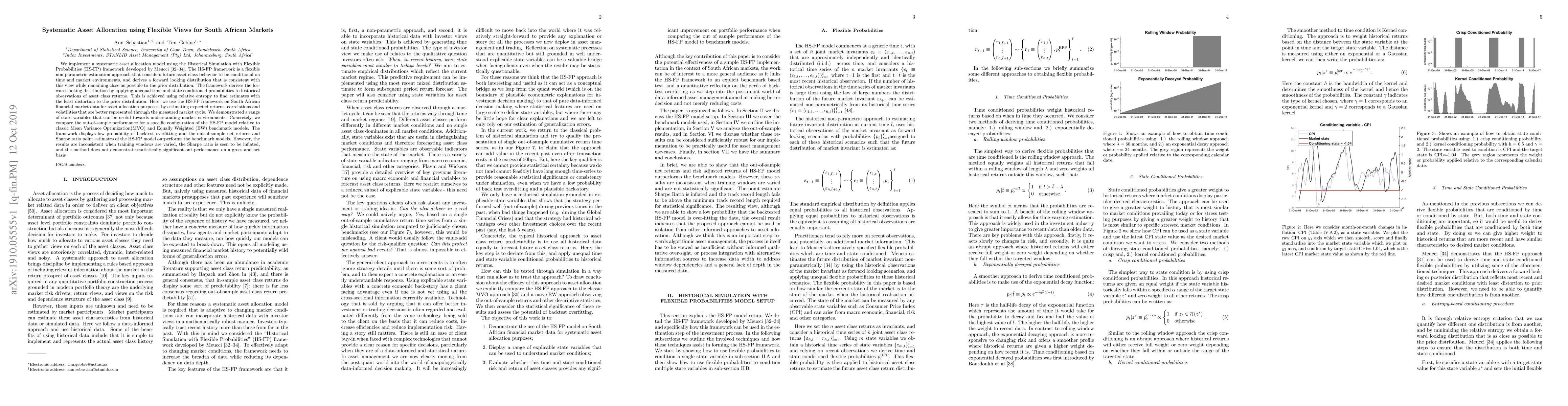 This paper implements a systematic asset allocation model using the Historical Simulation with Flexible Probabilities (HS-FP) framework for South African markets, showing improved out-of-sample performance compared to classic Mean Variance Optimization and Equally Weighted models. However, the results are inconsistent with varying training windows, leading to inflated Sharpe ratios and no statistically significant out-performance.