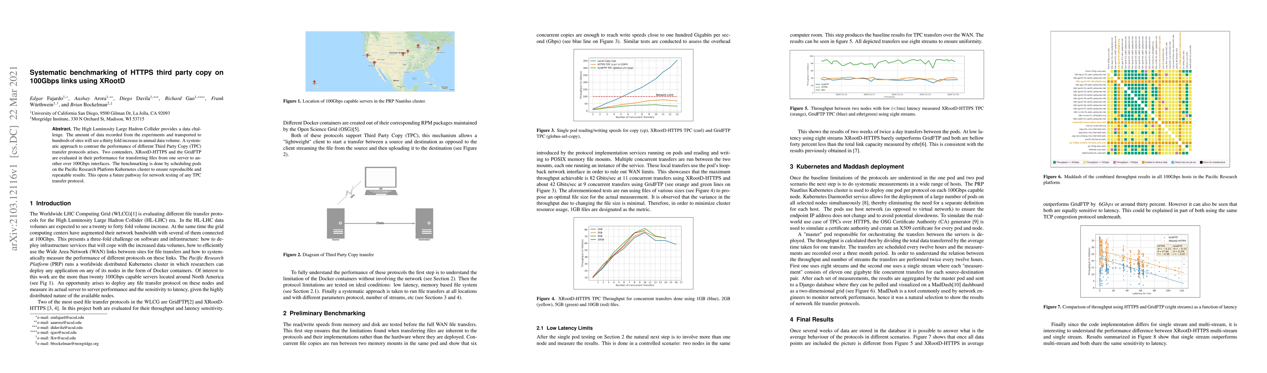 A systematic benchmarking study evaluates two third-party copy transfer protocols, XRootD-HTTPS and GridFTP, for transferring large data volumes over 100Gbps links, finding significant differences in performance.