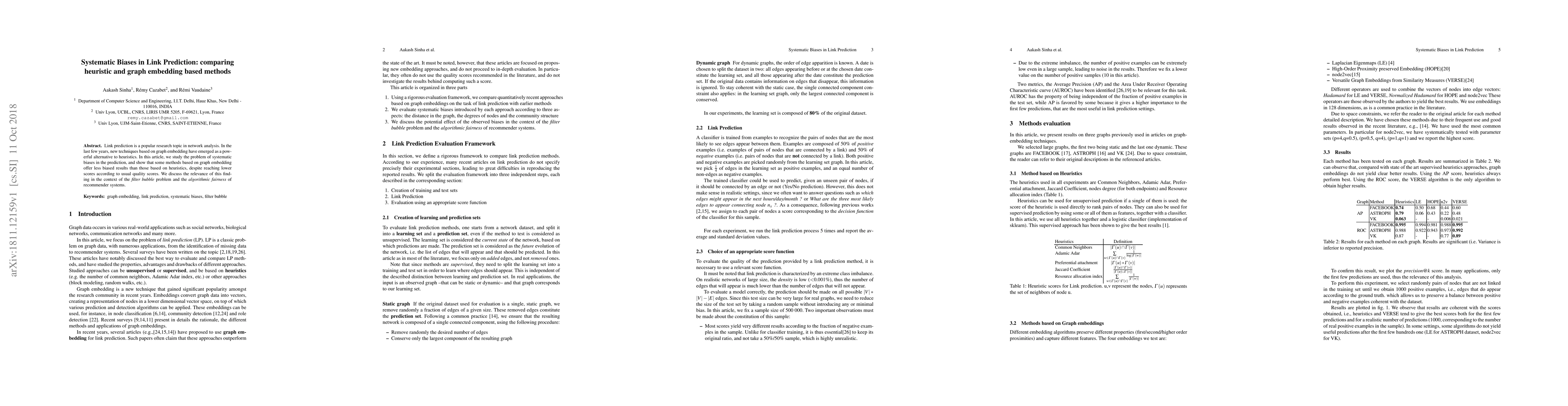 This paper compares heuristic and graph embedding methods for link prediction, finding that while graph embedding methods may score lower on traditional metrics, they exhibit less systematic bias, which is crucial for addressing issues like filter bubbles and algorithmic fairness in recommender systems.