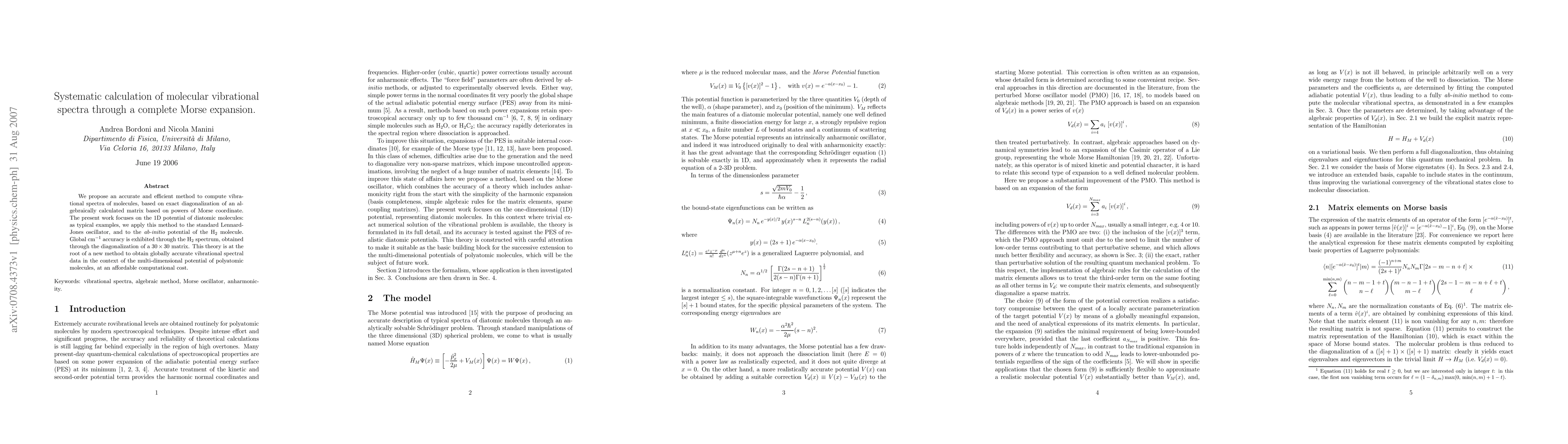 We propose an accurate and efficient method to compute vibrational spectra of molecules, based on exact diagonalization of an algebraically calculated matrix based on powers of Morse coordinate. The present work focuses on the 1D potential of diatomic molecules: as typical examples, we apply this method to the standard Lennard-Jones oscillator, and to the ab initio potential of the H2 molecule. Global cm-1 accuracy is exhibited through the H2 spectrum, obtained through the diagonalization of a 30 x 30 matrix. This theory is at the root of a new method to obtain globally accurate vibrational spectral data in the context of the multi-dimensional potential of polyatomic molecules, at an affordable computational cost.