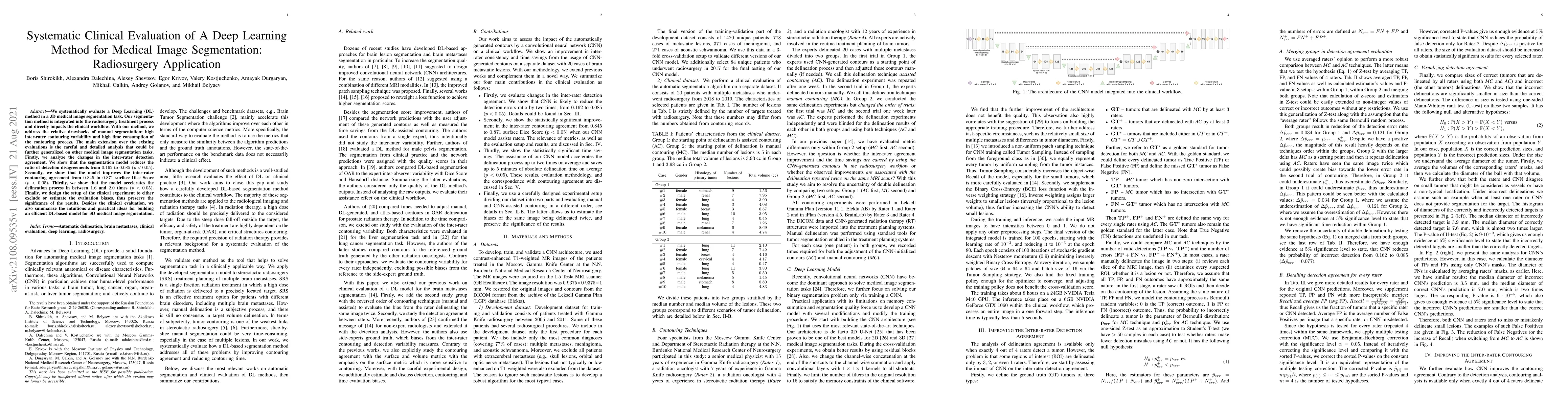 We systematically evaluate a Deep Learning (DL) method in a 3D medical image segmentation task. Our segmentation method is integrated into the radiosurgery treatment process and directly impacts the clinical workflow. With our method, we address the relative drawbacks of manual segmentation: high inter-rater contouring variability and high time consumption of the contouring process. The main extension over the existing evaluations is the careful and detailed analysis that could be further generalized on other medical image segmentation tasks. Firstly, we analyze the changes in the inter-rater detection agreement. We show that the segmentation model reduces the ratio of detection disagreements from 0.162 to 0.085 (p < 0.05). Secondly, we show that the model improves the inter-rater contouring agreement from 0.845 to 0.871 surface Dice Score (p < 0.05). Thirdly, we show that the model accelerates the delineation process in between 1.6 and 2.0 times (p < 0.05). Finally, we design the setup of the clinical experiment to either exclude or estimate the evaluation biases, thus preserve the significance of the results. Besides the clinical evaluation, we also summarize the intuitions and practical ideas for building an efficient DL-based model for 3D medical image segmentation.