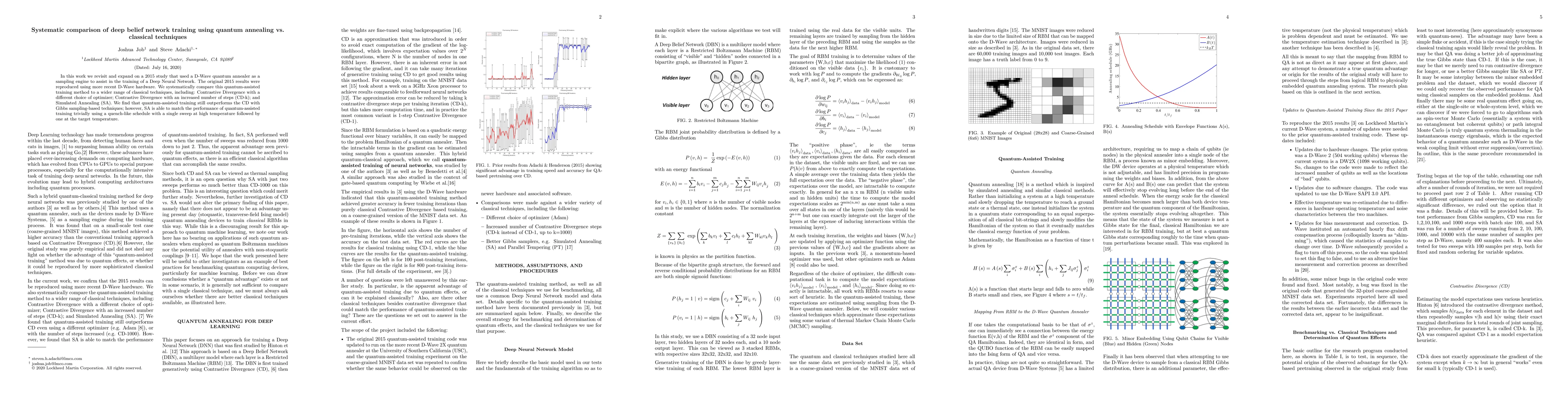 Quantum-assisted training of deep neural networks outperforms classical techniques like Contrastive Divergence and Simulated Annealing in some cases, but SA can match quantum performance with a specific schedule.