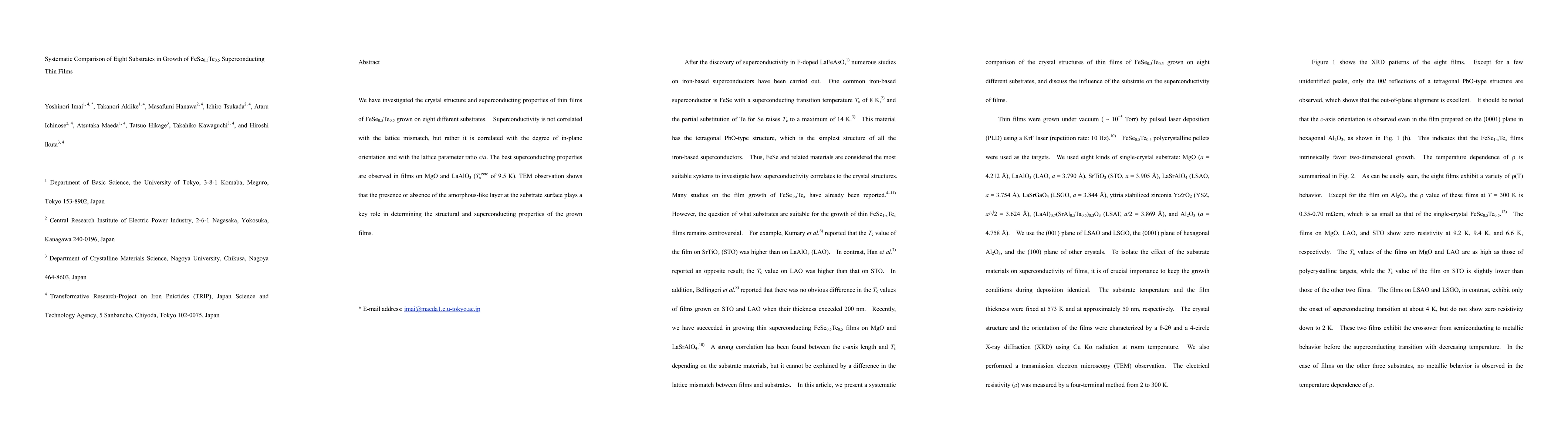 We have investigated the crystal structures and superconducting properties of thin films of FeSe$_{0.5}$Te$_{0.5}$ grown on eight different substrates. Superconductivity is not correlated with the lattice mismatch; rather it is correlated with the degree of in-plane orientation and with the lattice parameter ratio $c/a$. The best superconducting properties were observed in films on MgO and LaAlO$_3$ ($T_\mathrm{c}^\mathrm{zero}$ of 9.5 K). TEM observation showed that the presence or absence of an amorphous-like layer at the substrate surface plays a key role in determining the structural and superconducting properties of the grown films.