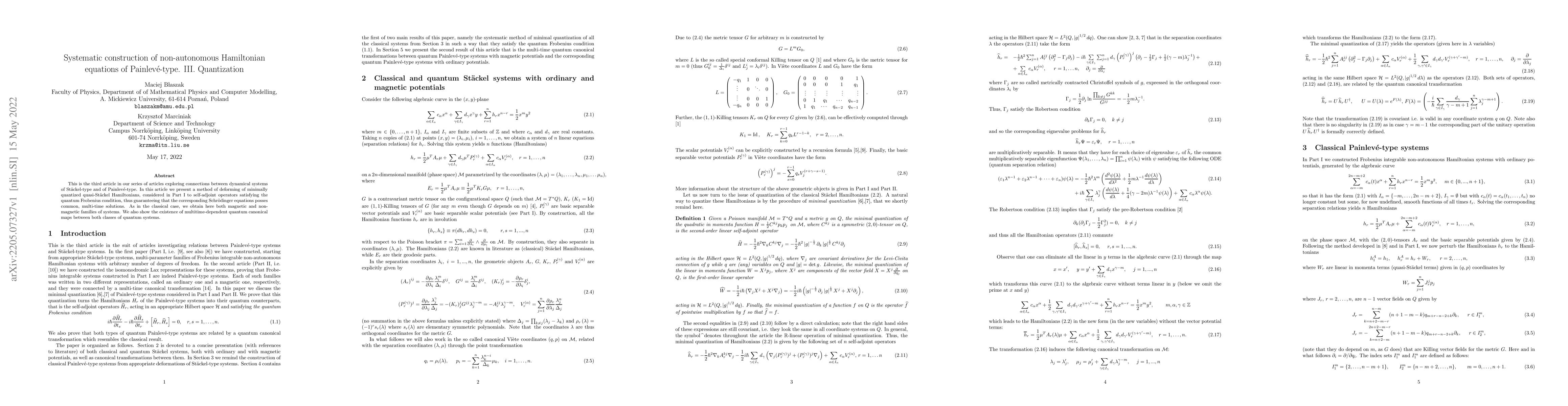 This is the third article in our series of articles exploring connections between dynamical systems of St\"ackel-type and of Painlev\'e-type. In this article we present a method of deforming of minimally quantized quasi-St\"ackel Hamiltonians, considered in Part I to self-adjoint operators satisfying the quantum Frobenius condition, thus guaranteeing that the corresponding Schr\"odinger equations posses common, multi-time solutions. As in the classical case, we obtain here both magnetic and non-magnetic families of systems. We also show the existence of multitime-dependent quantum canonical maps between both classes of quantum systems.