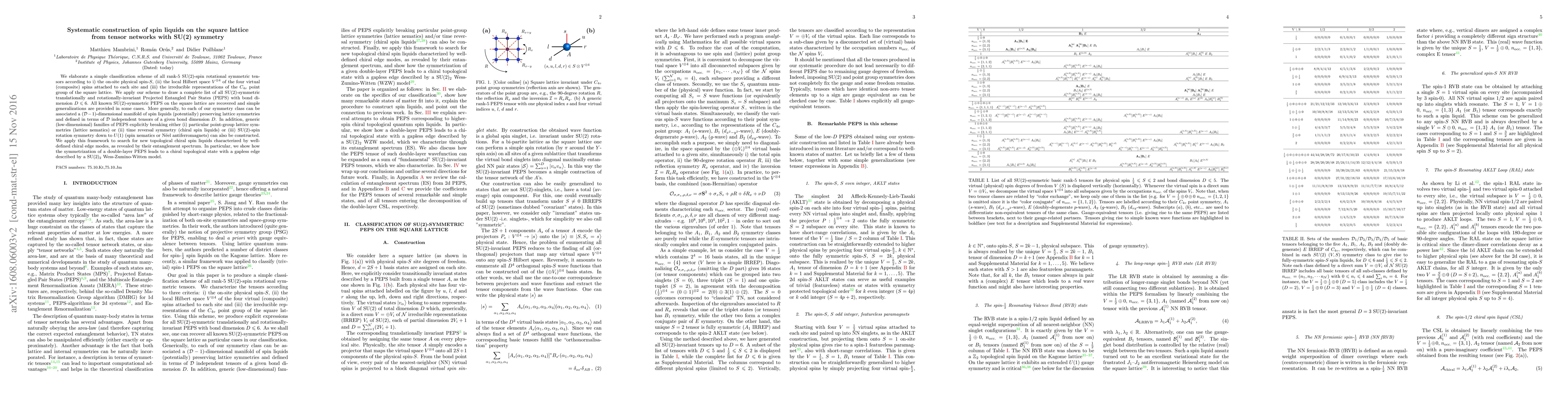 This paper systematically constructs spin liquids on the square lattice using tensor networks with SU(2) symmetry, classifying all rank-5 tensors and listing all SU(2)-symmetric Projected Entangled Pair States (PEPS) up to bond dimension 6. It also identifies families of PEPS breaking various symmetries and explores topological chiral spin liquids with chiral edge modes.