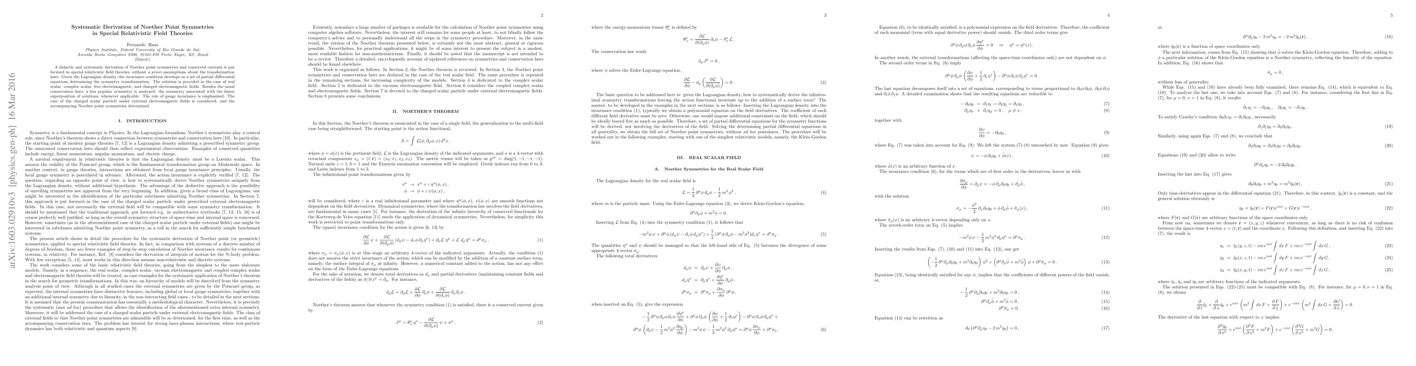 This paper systematically derives Noether point symmetries and conserved currents in special relativistic field theories from the Lagrangian density, without assuming specific transformation laws. It explores symmetries in various fields and highlights the role of gauge invariance, particularly in the context of charged scalar particles under external electromagnetic fields.