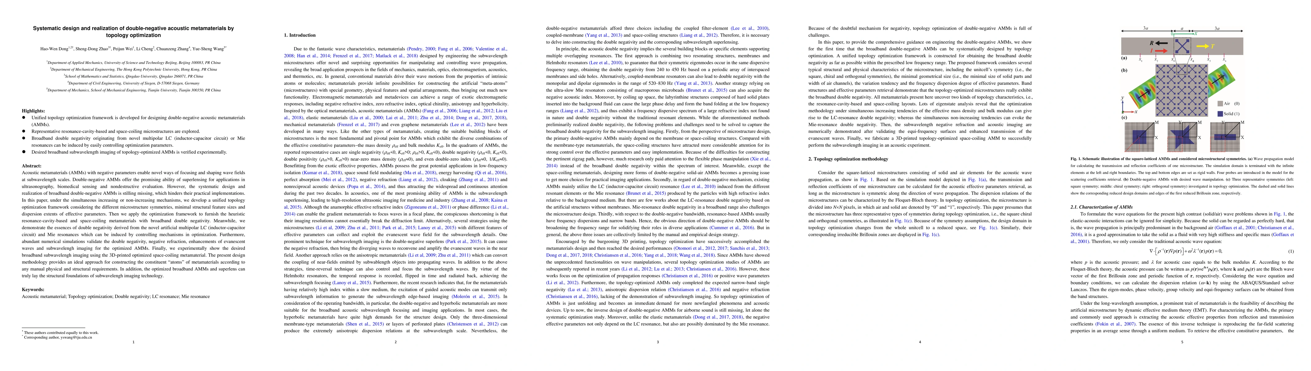 This paper presents a systematic topology optimization framework to design broadband double-negative acoustic metamaterials for enhanced subwavelength imaging. The approach leverages novel artificial multipolar LC and Mie resonances, validated through numerical simulations and experimentally demonstrated using 3D-printed space-coiling metamaterials.