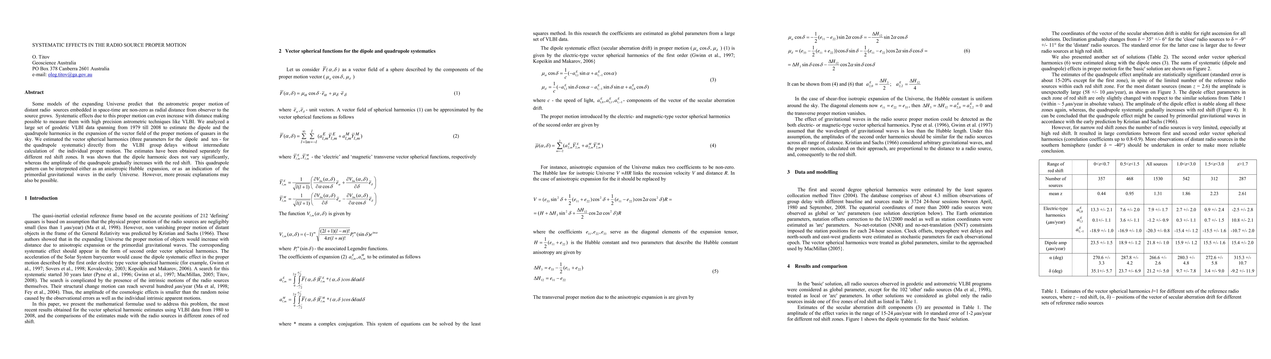 This paper investigates the systematic effects of the proper motion of distant radio sources, estimating dipole and quadrupole harmonics from VLBI data. The study finds a stable dipole but an increasing quadrupole amplitude with redshift, potentially indicating anisotropic Hubble expansion or primordial gravitational waves, though other explanations are also considered.