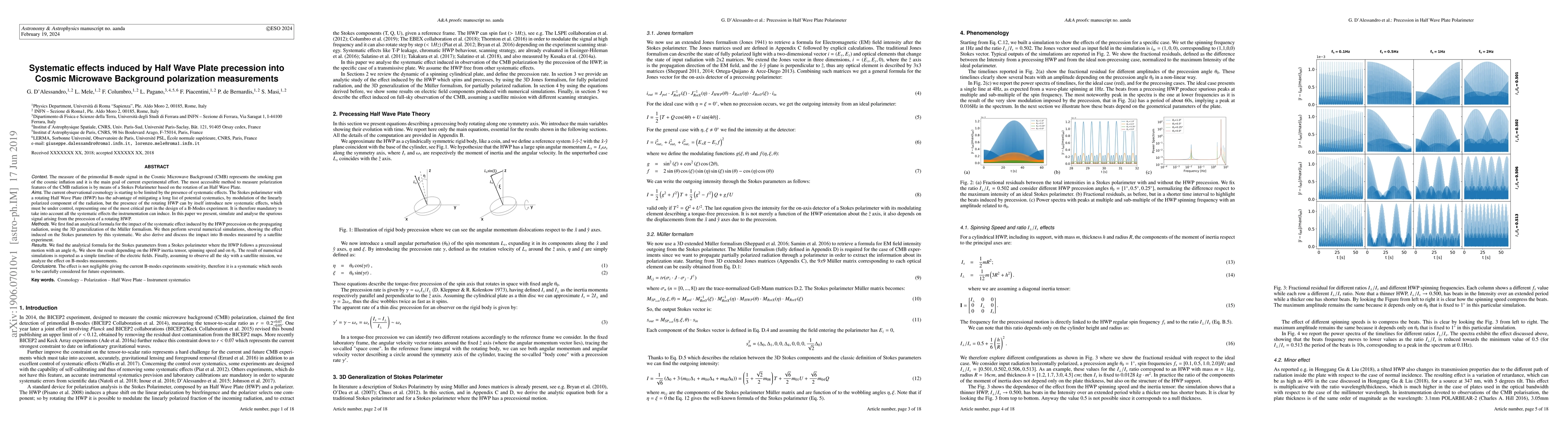 The most accessible method to measure polarization features of the CMB radiation is by means of a Stokes Polarimeter based on the rotation of an Half Wave Plate. The current observational cosmology is starting to be limited by the presence of systematic effects. The Stokes polarimeter with a rotating Half Wave Plate (HWP) has the advantage of mitigating a long list of potential systematics, by modulation of the linearly polarized component of the radiation, but the presence of the rotating HWP can by itself introduce new systematic effects, which must be under control, representing one of the most critical part in the design of a B-Modes experiment. In this paper we present, simulate and analyse the spurious signal arising from the precession of a rotating HWP. We first find an analytical formula for the impact of the systematic effect induced by the HWP precession on the propagating radiation, using the 3D generalization of the Muller formalism. We then perform several numerical simulations, showing the effect induced on the Stokes parameters by this systematic. We also derive and discuss the impact into B-modes measured by a satellite experiment. We find the analytical formula for the Stokes parameters from a Stokes polarimeter where the HWP follows a precessional motion with an angle $\theta_0$. We show the result depending on the HWP inertia tensor, spinning speed and on $\theta_0$. The result of numerical simulations is reported as a simple timeline of the electric fields. Finally, assuming to observe all the sky with a satellite mission, we analyze the effect on B-modes measurements. The effect is not negligible giving the current B-modes experiments sensitivity, therefore it is a systematic which needs to be carefully considered for future experiments.