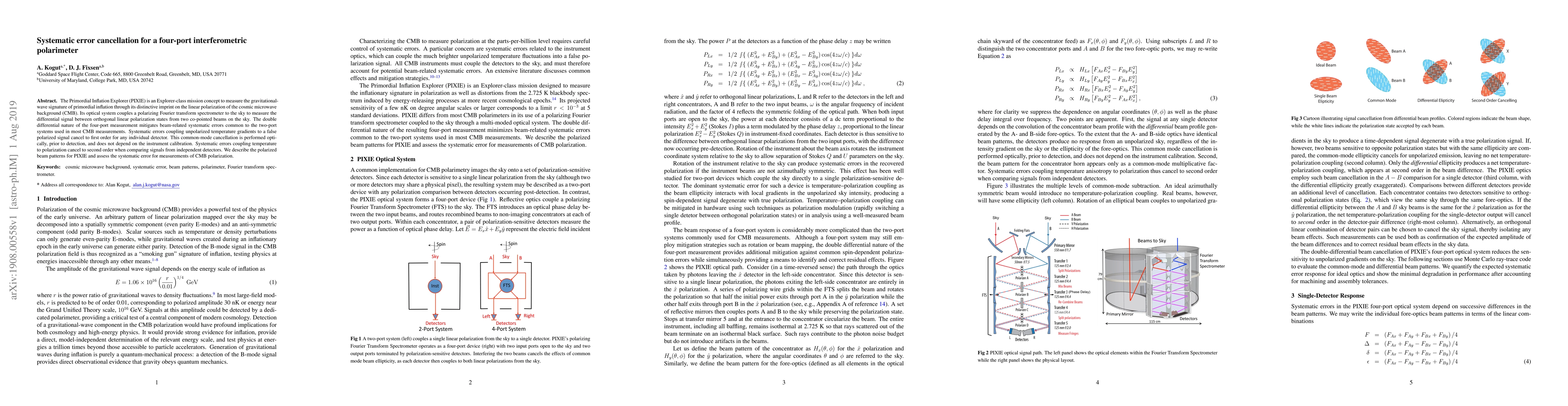 The PIXIE mission aims to detect gravitational waves from primordial inflation via CMB polarization measurements. Its four-port interferometric polarimeter cancels systematic errors optically before detection, reducing beam-related errors and ensuring accurate polarization signal measurement.