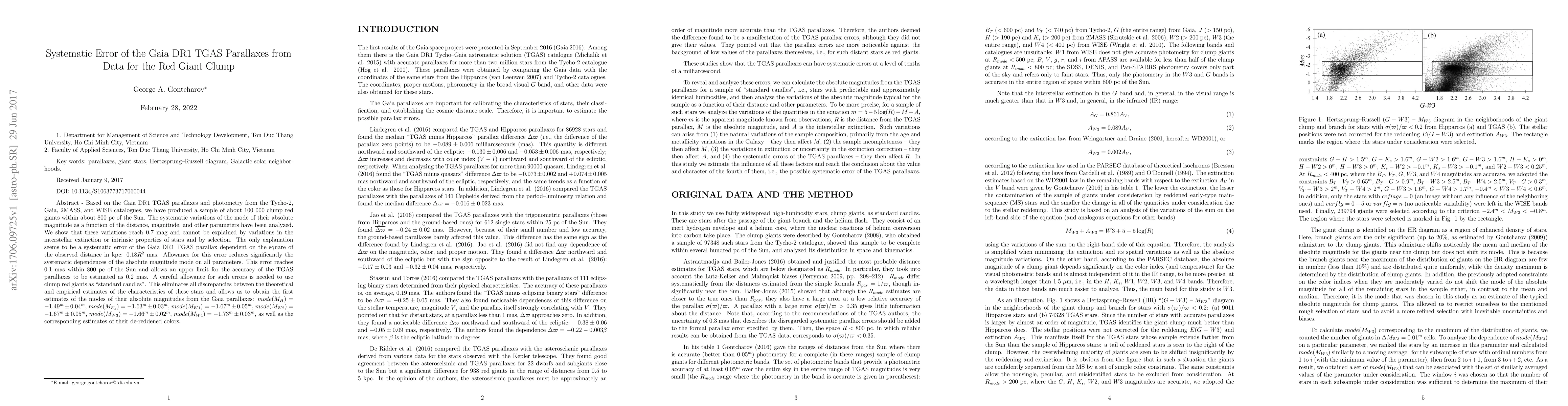 This paper identifies a systematic error in Gaia DR1 TGAS parallaxes for red giant clump stars, explaining observed magnitude variations by a parallax error proportional to the square of the distance. Correcting for this error provides new estimates for the absolute magnitudes and colors of these stars.