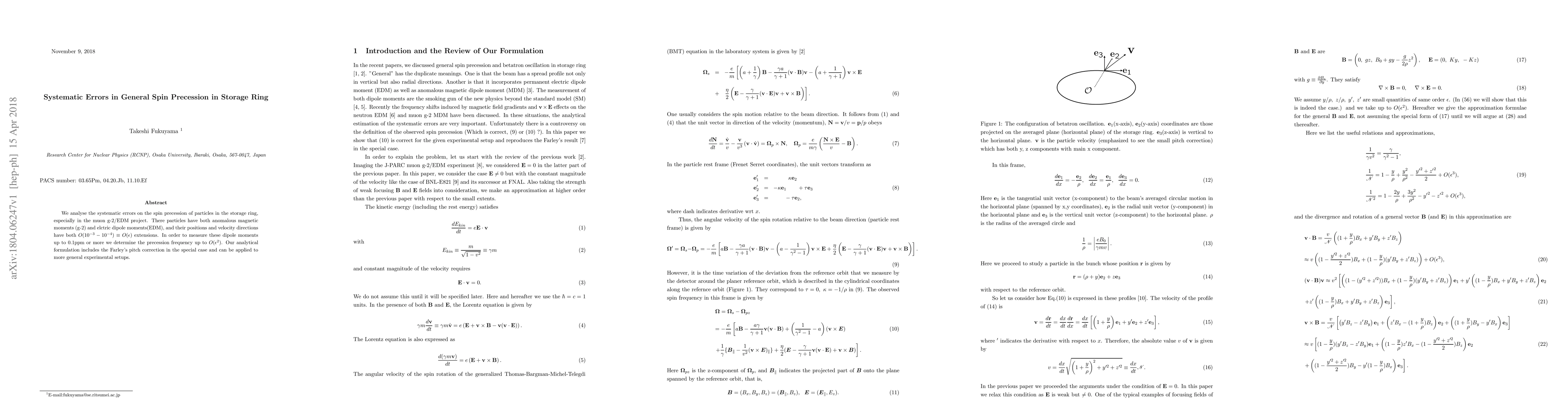 We analyse the systematic errors on the spin precession of particles in the storage ring, especially in the muon g-2/EDM project. There particles have both anomalous magnetic moments (g-2) and elctric dipole moments(EDM), and their positions and velocity directions have both $O(10^{-3}-10^{-4})\equiv O(\epsilon)$ extensions. In order to measure these dipole moments up to $0.1$ppm or more we determine the precession frequency up to $O(\epsilon^2)$. Our analytical formulation includes the Farley's pitch correction in the special case and can be applied to more general experimental setups.