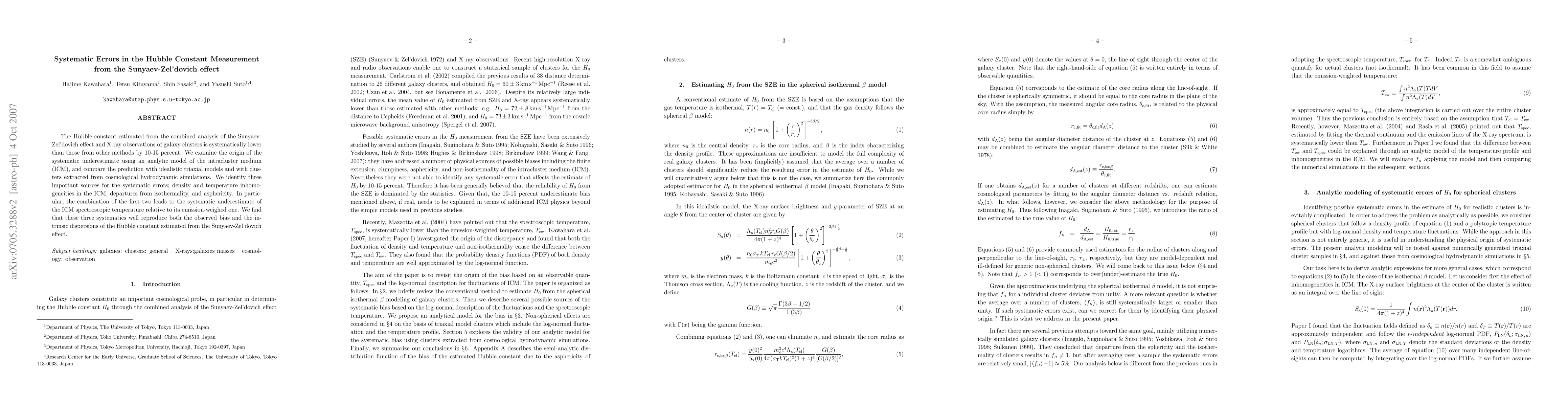 The Hubble constant estimated from the combined analysis of the Sunyaev-Zel'dovich effect and X-ray observations of galaxy clusters is systematically lower than those from other methods by 10-15 percent. We examine the origin of the systematic underestimate using an analytic model of the intracluster medium (ICM), and compare the prediction with idealistic triaxial models and with clusters extracted from cosmological hydrodynamical simulations. We identify three important sources for the systematic errors; density and temperature inhomogeneities in the ICM, departures from isothermality, and asphericity. In particular, the combination of the first two leads to the systematic underestimate of the ICM spectroscopic temperature relative to its emission-weighed one. We find that these three systematics well reproduce both the observed bias and the intrinsic dispersions of the Hubble constant estimated from the Sunyaev-Zel'dovich effect.
