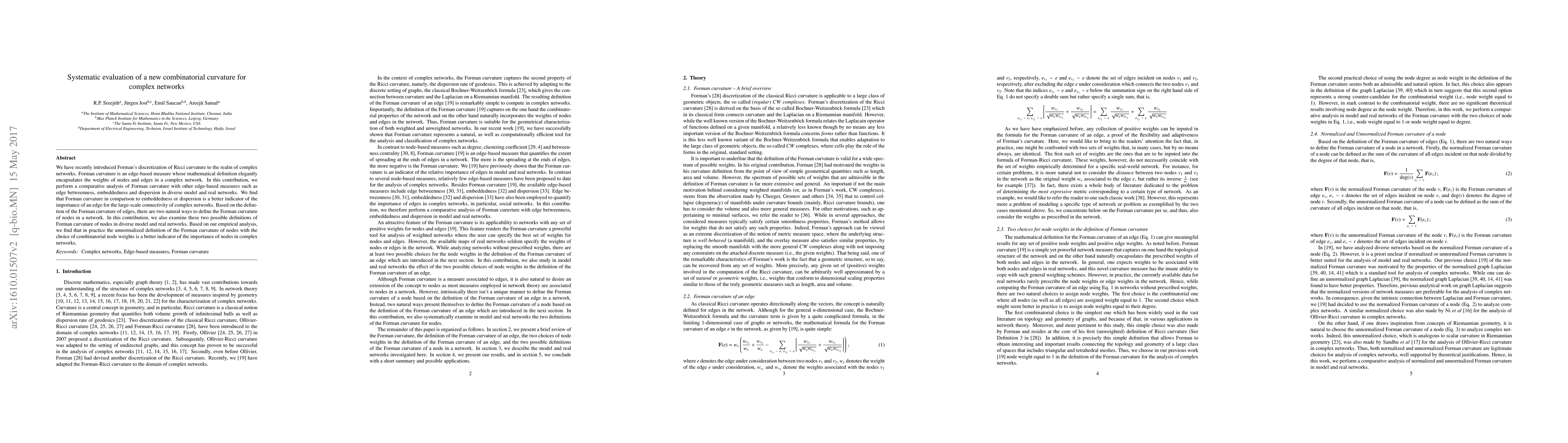 A new method for measuring curvature in complex networks called Forman's discretization was found to be a better indicator of an edge's importance than other measures in this study. The unnormalized version of the node-based Forman curvature also showed promise as a measure of node importance.