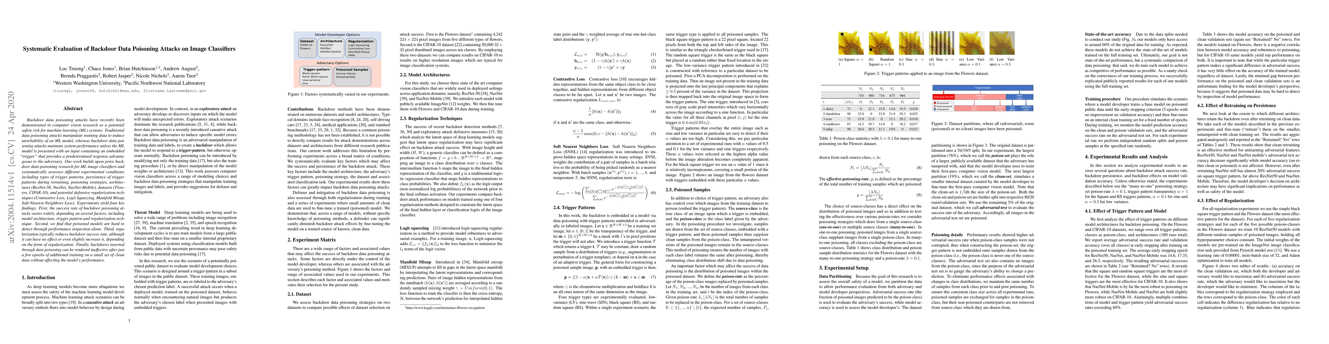This research systematically evaluates backdoor data poisoning attacks on image classifiers, assessing various triggers, architectures, datasets, and defensive techniques. Key findings include variable attack success rates depending on model and trigger, difficulty in detection through performance inspection, mixed effects of regularization, and the potential for re-training to neutralize backdoors.