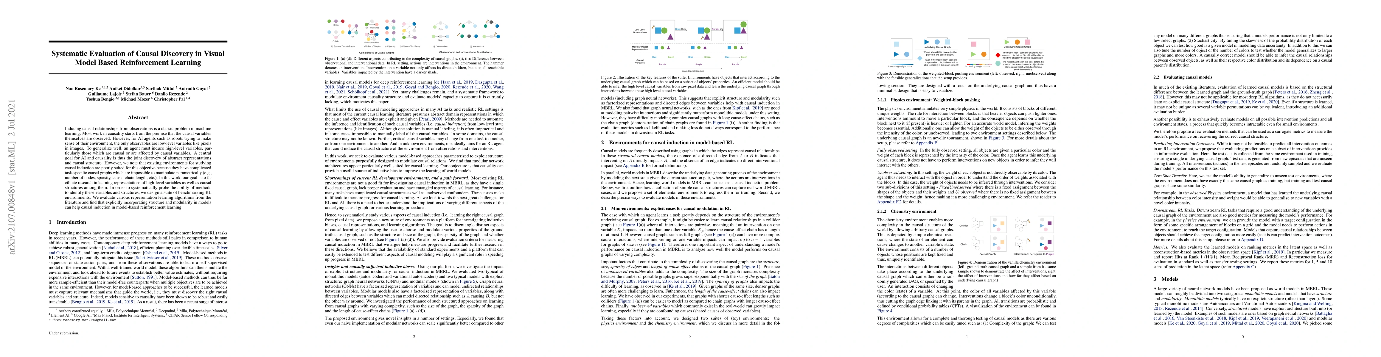 This paper develops a suite of benchmarking environments for model-based reinforcement learning to systematically evaluate causal discovery. It finds that incorporating structural and modular elements into representation learning algorithms enhances the identification of high-level causal variables and structures.