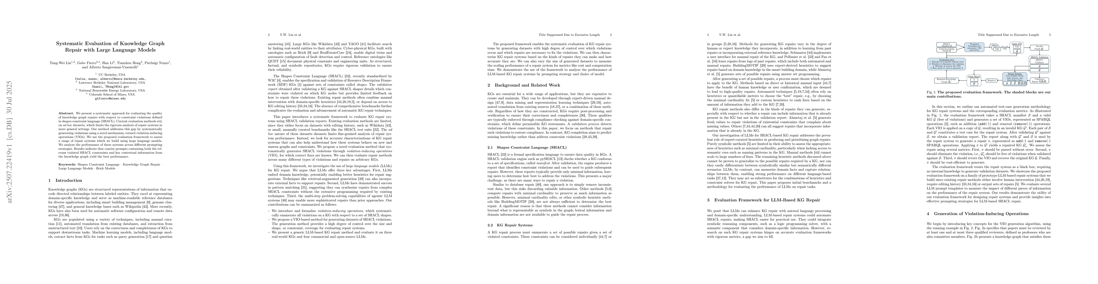 The paper presents a systematic approach for evaluating knowledge graph repair systems using SHACL constraints, generating violations through violation-inducing operations (VIOs) and assessing various large language model (LLM) prompting strategies.