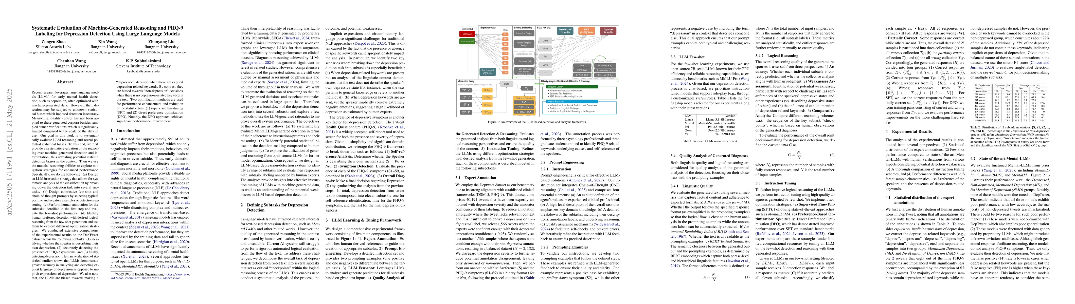 The research systematically evaluates large language models' (LLMs) reasoning for depression detection using machine-generated data. It involves designing instruction strategies, contrastive few-shot and chain-of-thought prompts, human annotation for subtasks, and optimization strategies like supervised fine-tuning (SFT) and direct preference optimization (DPO).