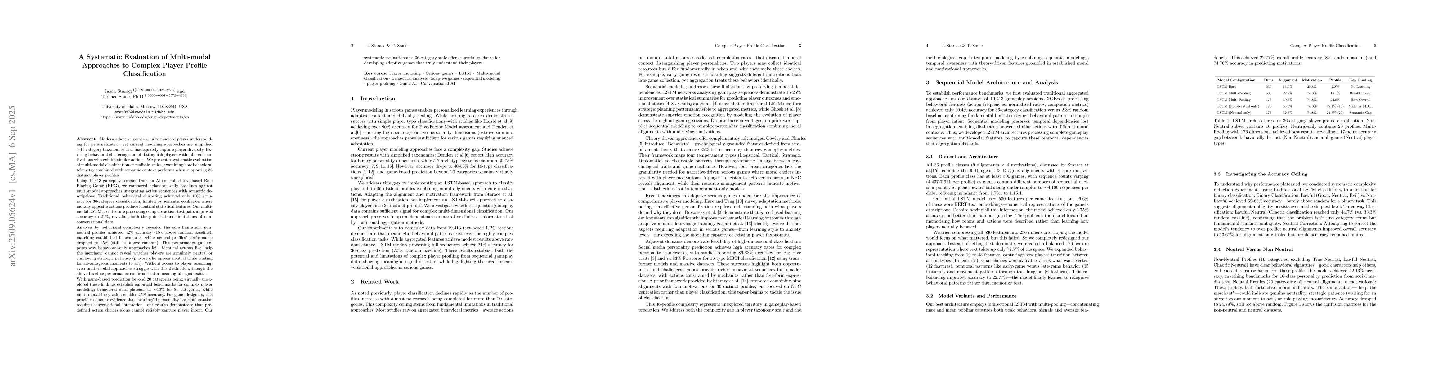 Modern adaptive games require nuanced player understanding, yet most models use simplified 5-10 category taxonomies that fail to capture diversity. Behavioral clustering cannot distinguish players with different motivations who act similarly. We present a systematic evaluation of multi-modal classification at scale, combining behavioral telemetry with semantic context to support 36 player profiles. Using 19,413 gameplay sessions from an AI-controlled text-based RPG, we compared behavioral-only baselines with multi-modal approaches that integrate action sequences and semantic descriptions. Traditional clustering achieved only 10% accuracy for 36-category classification, limited by semantic conflation where opposite actions produced identical features. Our multi-modal LSTM processing action-text pairs improved accuracy to 21%, showing both potential and limits of non-conversational data. Analysis by behavioral complexity revealed that non-neutral profiles reached 42% accuracy (15x above random), while neutral profiles dropped to 25% (9x above random). Identical actions such as "help the merchant" cannot reveal whether a player is neutral or strategically waiting. Without access to reasoning, even multi-modal models struggle, though above-baseline results confirm a meaningful signal. Since prediction beyond 20 categories remains unexplored, our findings establish benchmarks for complex player modeling. Behavioral data alone plateaus near 10% for 36 categories, while multi-modal integration enables 25%. For designers, this shows that personality-based adaptation requires conversational interaction, as predefined choices cannot capture intent. Our evaluation at 36-category scale offers guidance for building adaptive games that better understand their players.