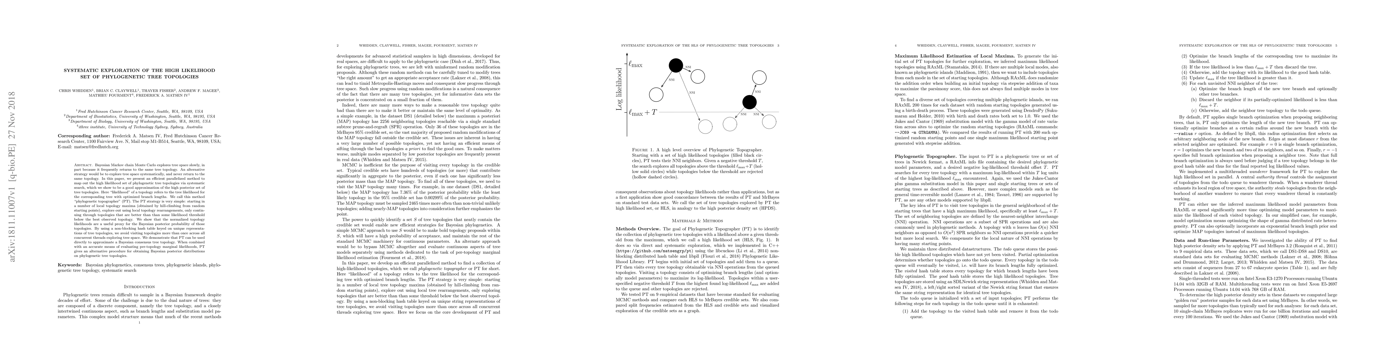 This paper introduces a parallelized method called phylogenetic topographer (PT) to systematically explore and map out the high likelihood set of phylogenetic tree topologies, avoiding revisiting the same topology. PT starts from local maxima and explores using local rearrangements, focusing on topologies above a likelihood threshold, demonstrating its effectiveness as an approximation for the high posterior set of tree topologies.