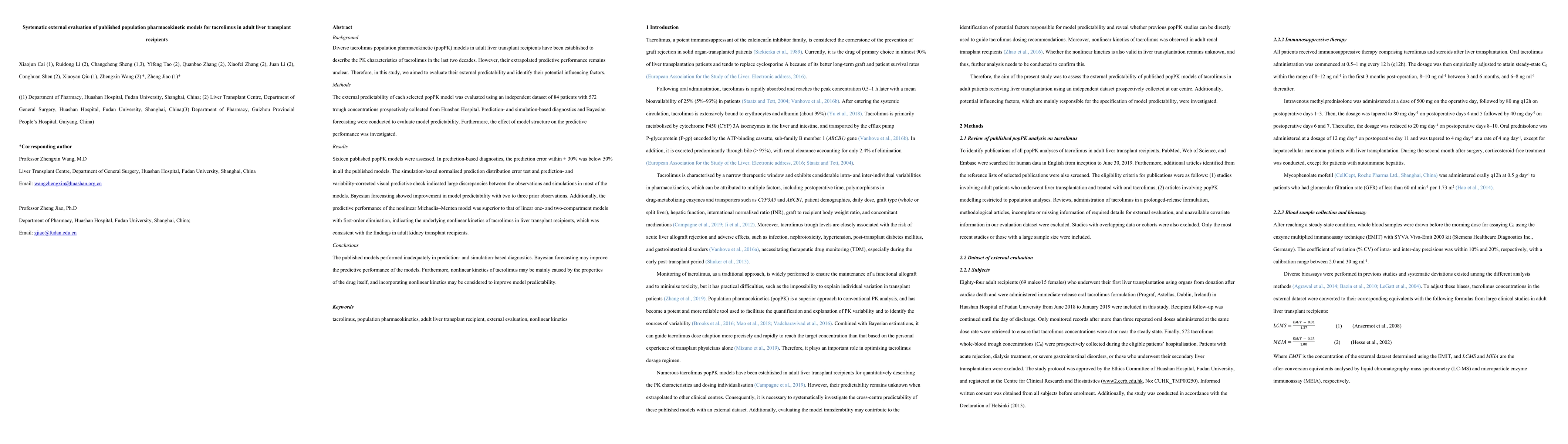 This study systematically evaluated the external predictability of 16 published population pharmacokinetic models for tacrolimus in adult liver transplant recipients using an independent dataset. The results showed inadequate predictive performance, with Bayesian forecasting offering some improvement, and nonlinear models outperforming linear ones, suggesting the need for incorporating nonlinear kinetics to enhance model accuracy.