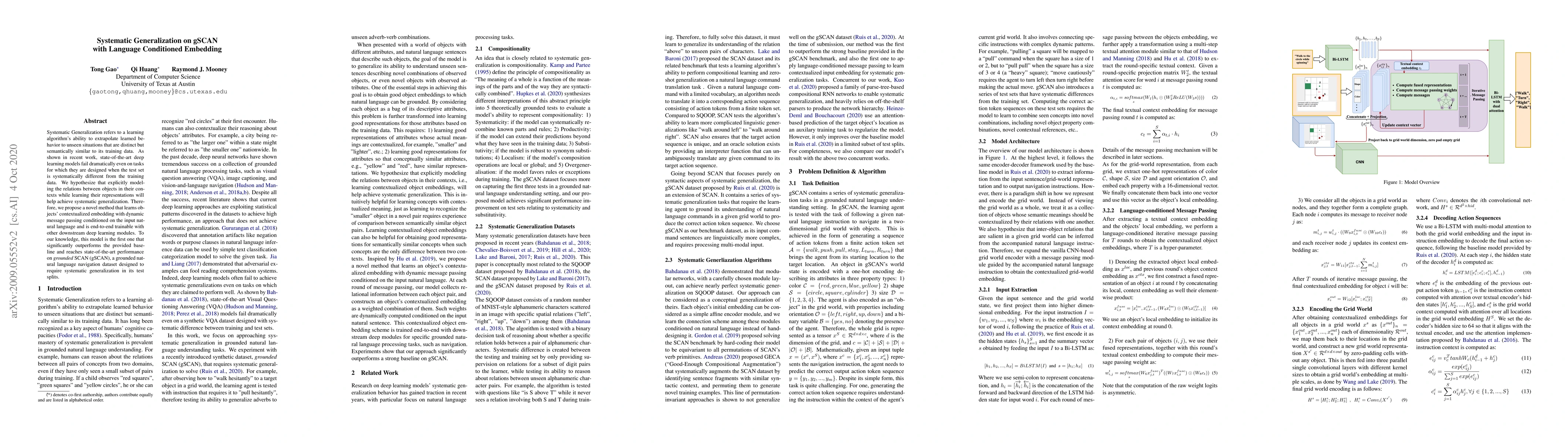 This paper proposes a novel method for systematic generalization using gSCAN, which learns contextualized embeddings through dynamic message passing conditioned on input natural language. The model achieves state-of-the-art performance on the grounded-SCAN dataset, outperforming baselines by explicitly modeling object-context relations.
