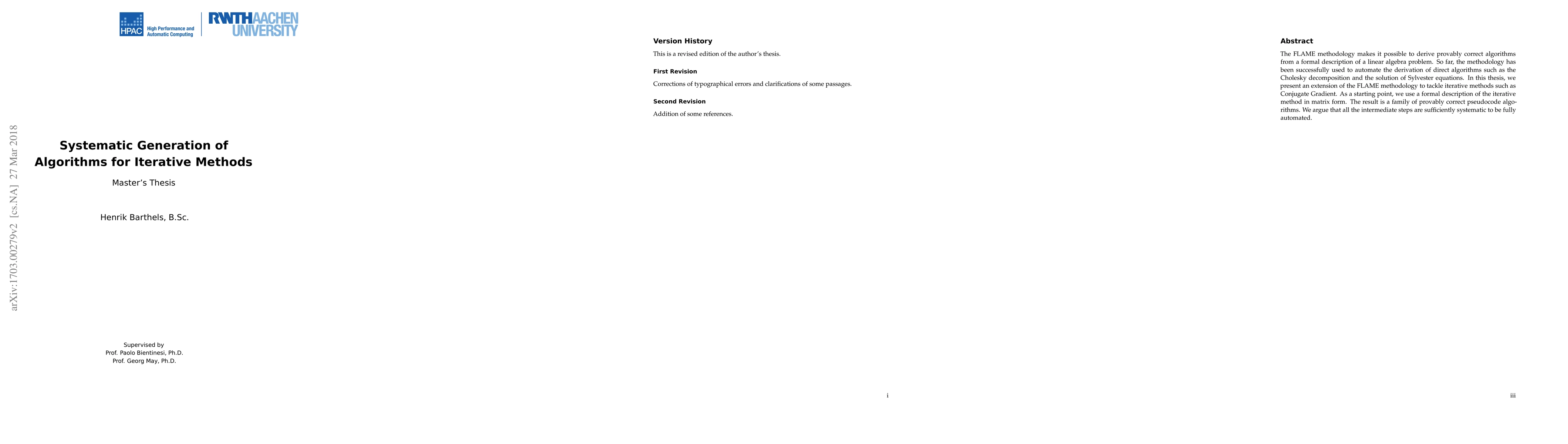 The FLAME methodology makes it possible to derive provably correct algorithms from a formal description of a linear algebra problem. So far, the methodology has been successfully used to automate the derivation of direct algorithms such as the Cholesky decomposition and the solution of Sylvester equations. In this thesis, we present an extension of the FLAME methodology to tackle iterative methods such as Conjugate Gradient. As a starting point, we use a formal description of the iterative method in matrix form. The result is a family of provably correct pseudocode algorithms. We argue that all the intermediate steps are sufficiently systematic to be fully automated.
