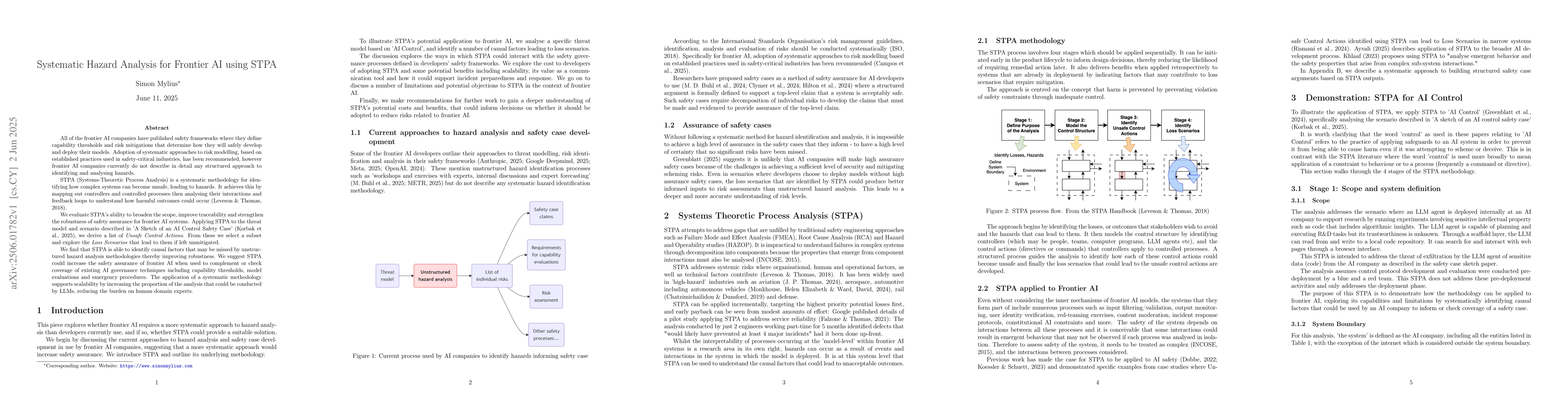 This work is novel in applying STPA, traditionally used in safety-critical industries, to frontier AI systems, thereby offering a structured method for hazard analysis that complements existing AI governance techniques.