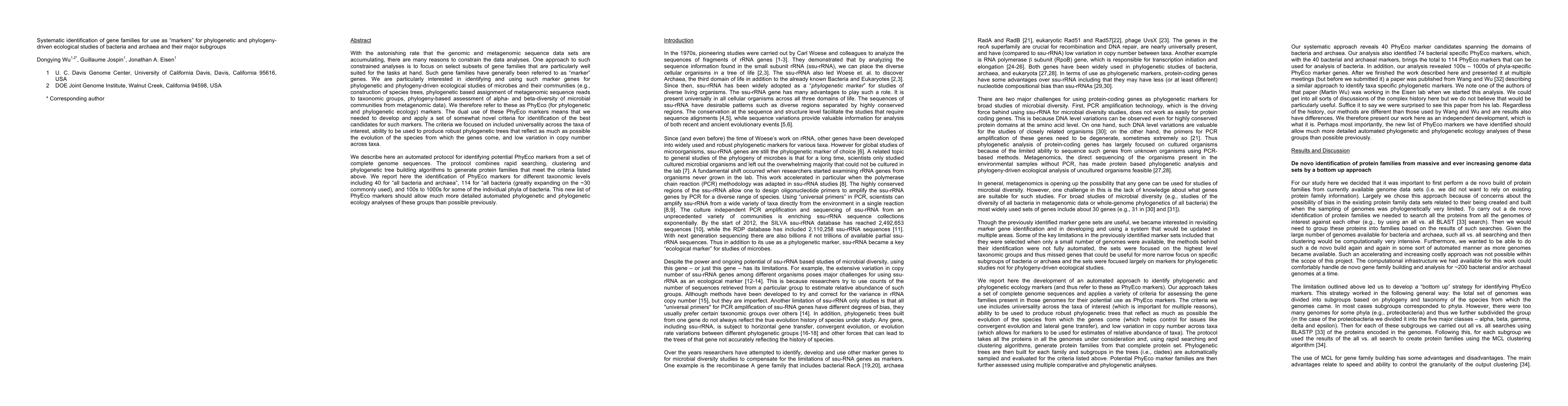 With the astonishing rate that the genomic and metagenomic sequence data sets are accumulating, there are many reasons to constrain the data analyses. One approach to such constrained analyses is to focus on select subsets of gene families that are particularly well suited for the tasks at hand. Such gene families have generally been referred to as marker genes. We are particularly interested in identifying and using such marker genes for phylogenetic and phylogeny-driven ecological studies of microbes and their communities. We therefore refer to these as PhyEco (for phylogenetic and phylogenetic ecology) markers. The dual use of these PhyEco markers means that we needed to develop and apply a set of somewhat novel criteria for identification of the best candidates for such markers. The criteria we focused on included universality across the taxa of interest, ability to be used to produce robust phylogenetic trees that reflect as much as possible the evolution of the species from which the genes come, and low variation in copy number across taxa. We describe here an automated protocol for identifying potential PhyEco markers from a set of complete genome sequences. The protocol combines rapid searching, clustering and phylogenetic tree building algorithms to generate protein families that meet the criteria listed above. We report here the identification of PhyEco markers for different taxonomic levels including 40 for all bacteria and archaea, 114 for all bacteria, and much more for some of the individual phyla of bacteria. This new list of PhyEco markers should allow much more detailed automated phylogenetic and phylogenetic ecology analyses of these groups than possible previously.