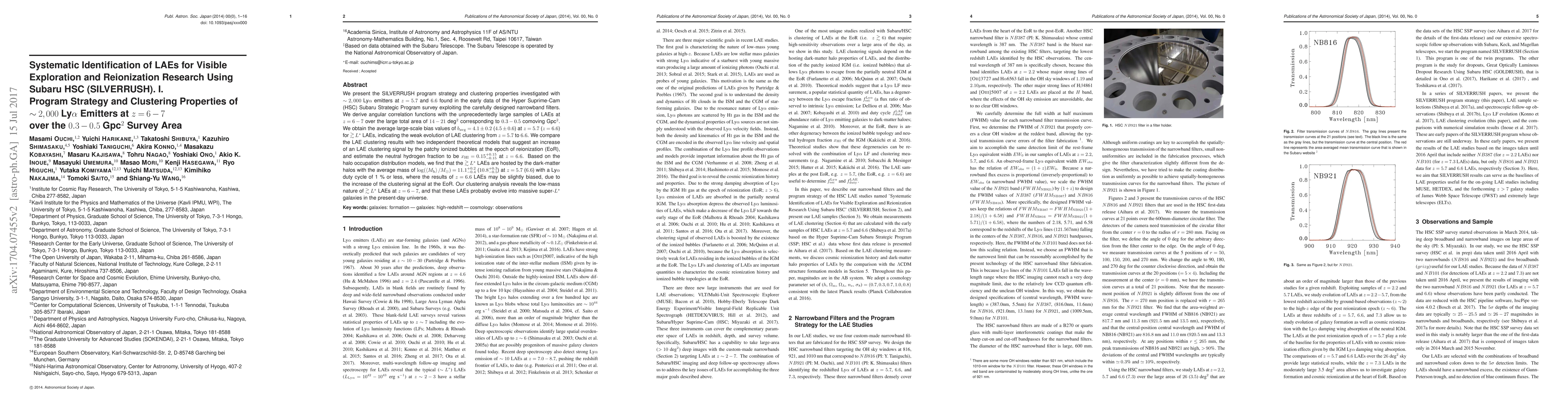 We present the SILVERRUSH program strategy and clustering properties investigated with $\sim 2,000$ Ly$\alpha$ emitters at $z=5.7$ and $6.6$ found in the early data of the Hyper Suprime-Cam (HSC) Subaru Strategic Program survey exploiting the carefully designed narrowband filters. We derive angular correlation functions with the unprecedentedly large samples of LAEs at $z=6-7$ over the large total area of $14-21$ deg$^2$ corresponding to $0.3-0.5$ comoving Gpc$^2$. We obtain the average large-scale bias values of $b_{\rm avg}=4.1\pm 0.2$ ($4.5\pm 0.6$) at $z=5.7$ ($z=6.6$) for $\gtrsim L^*$ LAEs, indicating the weak evolution of LAE clustering from $z=5.7$ to $6.6$. We compare the LAE clustering results with two independent theoretical models that suggest an increase of an LAE clustering signal by the patchy ionized bubbles at the epoch of reionization (EoR), and estimate the neutral hydrogen fraction to be $x_{\rm HI}=0.15^{+0.15}_{-0.15}$ at $z=6.6$. Based on the halo occupation distribution models, we find that the $\gtrsim L^*$ LAEs are hosted by the dark-matter halos with the average mass of $\log (\left < M_{\rm h} \right >/M_\odot) =11.1^{+0.2}_{-0.4}$ ($10.8^{+0.3}_{-0.5}$) at $z=5.7$ ($6.6$) with a Ly$\alpha$ duty cycle of 1 % or less, where the results of $z=6.6$ LAEs may be slightly biased, due to the increase of the clustering signal at the EoR. Our clustering analysis reveals the low-mass nature of $\gtrsim L^*$ LAEs at $z=6-7$, and that these LAEs probably evolve into massive super-$L^*$ galaxies in the present-day universe.
