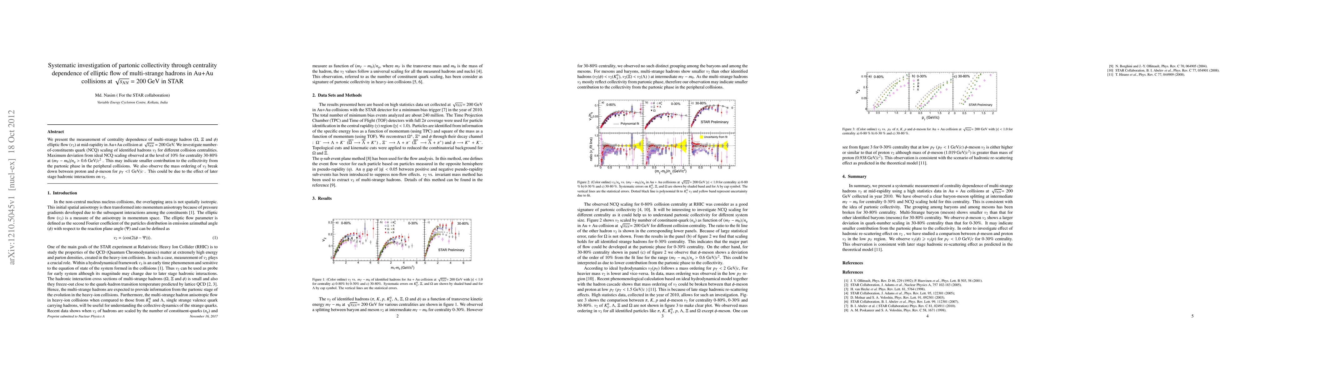 This paper investigates the centrality dependence of elliptic flow for multi-strange hadrons in Au+Au collisions at 200 GeV, finding deviations from ideal scaling that suggest reduced partonic collectivity in peripheral collisions. It also notes a breakdown in mass ordering of $v_{2}$ for low transverse momentum, likely due to hadronic interactions.