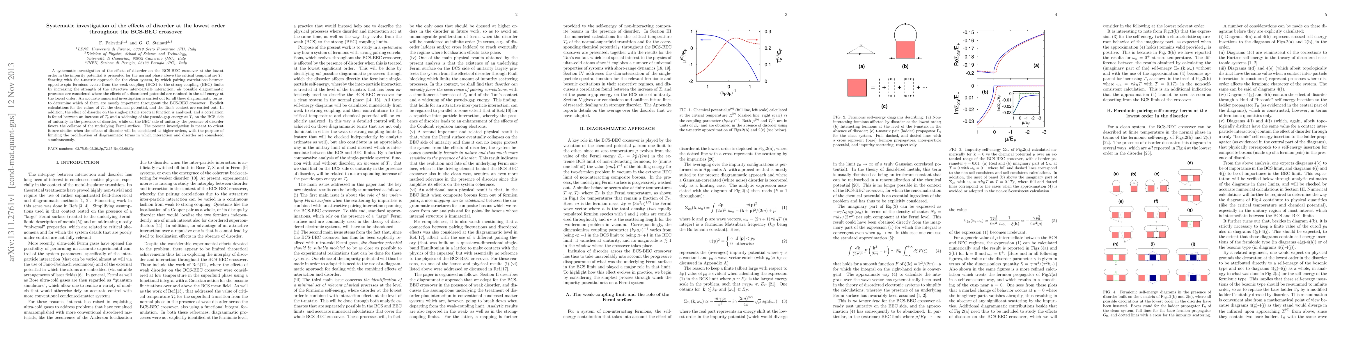 This paper systematically investigates the impact of disorder on the BCS-BEC crossover at the lowest order in impurity potential, revealing significant effects on critical temperature, chemical potential, and Tan's contact. Disorder influences the pseudo-gap energy and Fermi surface collapse, with implications for future studies on higher-order interactions.