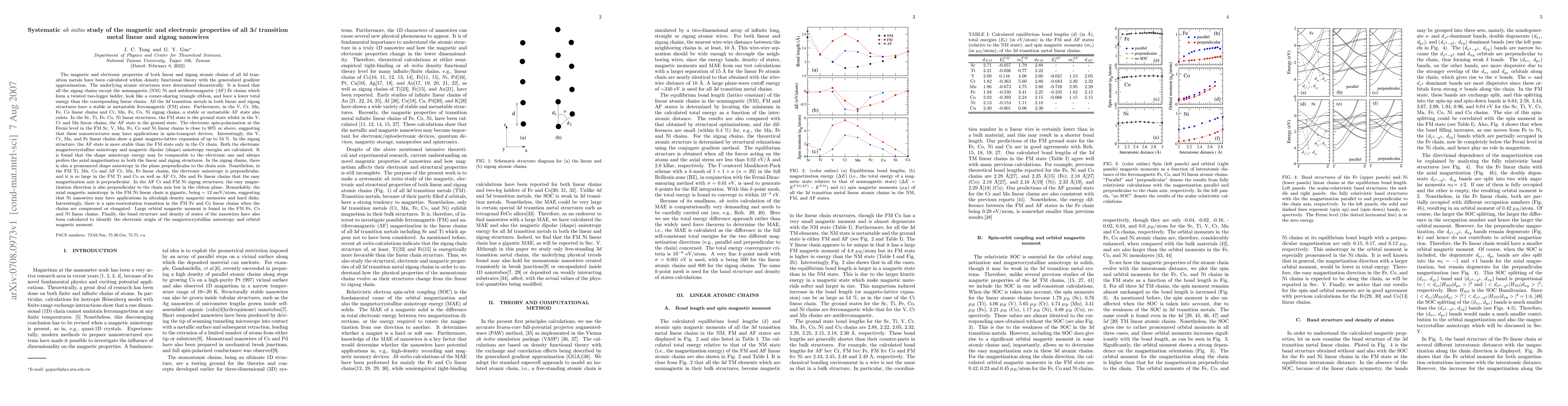 This study reveals that 3d transition metal zigzag nanowires generally exhibit lower energy and a stable ferromagnetic state compared to their linear counterparts. The magnetic anisotropy favors axial magnetization in both structures, with significant shape anisotropy also present in zigzag chains.