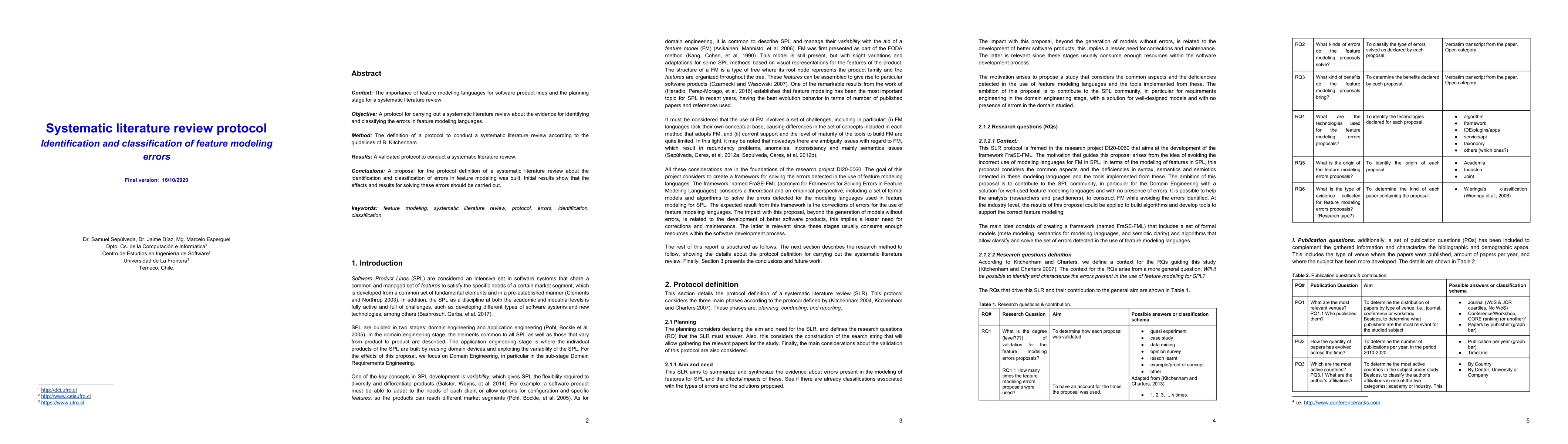 Context: The importance of feature modeling languages for software product lines and the planning stage for a systematic literature review. Objective: A protocol for carrying out a systematic literature review about the evidence for identifying and classifying the errors in feature modeling languages. Method: The definition of a protocol to conduct a systematic literature review according to the guidelines of B. Kitchenham. Results: A validated protocol to conduct a systematic literature review. Conclusions: A proposal for the protocol definition of a systematic literature review about the identification and classification of errors in feature modeling was built. Initial results show that the effects and results for solving these errors should be carried out.