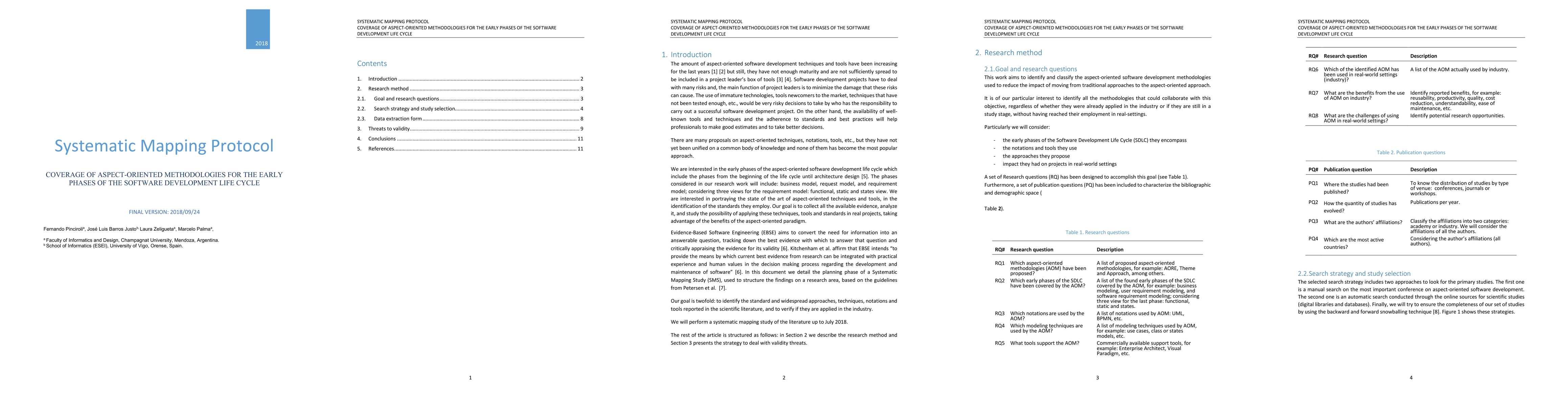 This systematic mapping of aspect-oriented methodologies in software development aims to identify mature techniques, tools, and standards for early phases of the SDLC, focusing on benefits for real projects.
