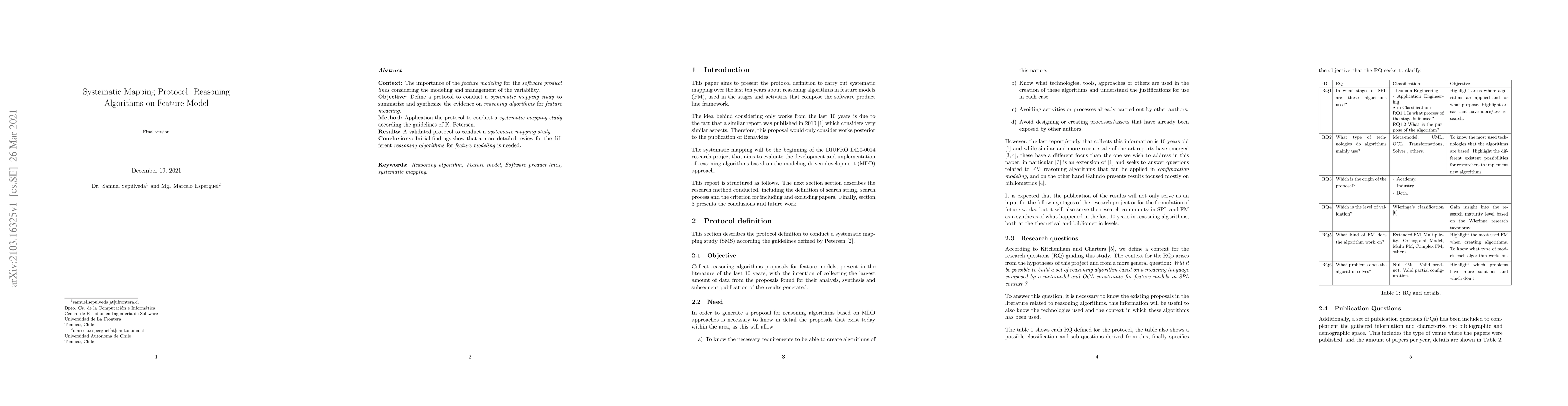 The paper describes a systematic mapping study protocol to summarize and synthesize evidence on reasoning algorithms for feature modeling, following K. Petersen's guidelines.