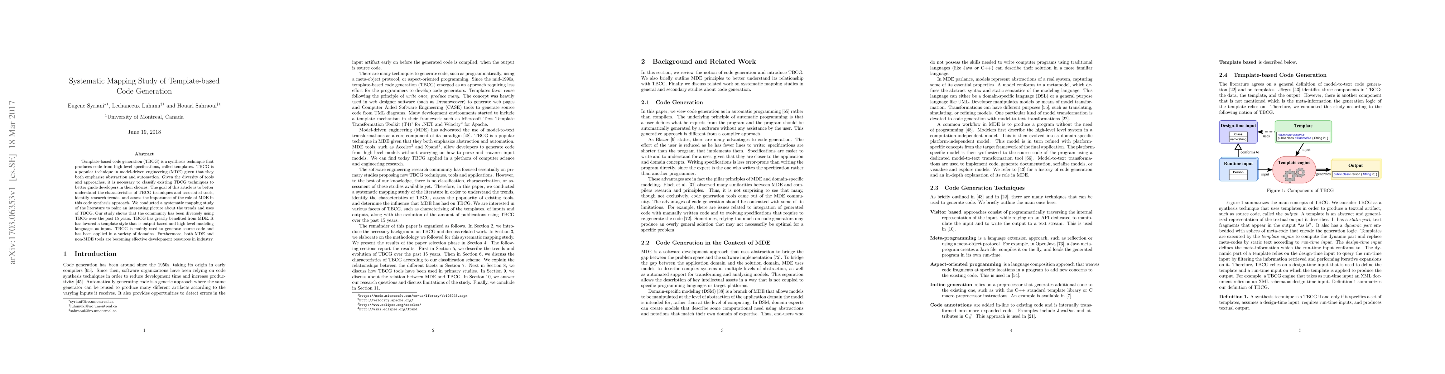 This paper conducts a systematic mapping study to classify template-based code generation (TBCG) techniques and tools, highlighting their characteristics and research trends. The study reveals that TBCG has been extensively utilized over the past 15 years, with a strong emphasis on model-driven engineering (MDE) and the use of high-level modeling languages.