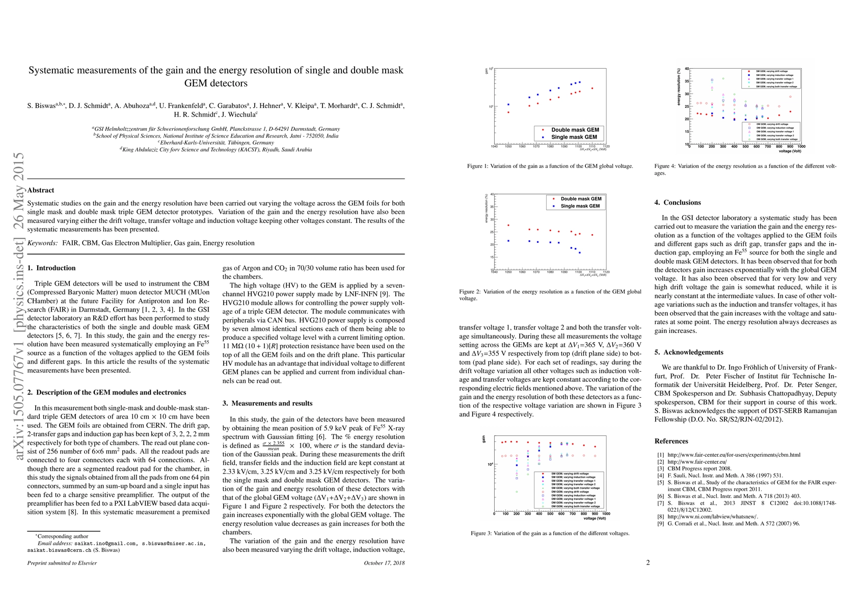This paper systematically measures the gain and energy resolution of single and double mask GEM detectors by varying the GEM foil voltages and other relevant parameters, presenting comprehensive results on their performance.