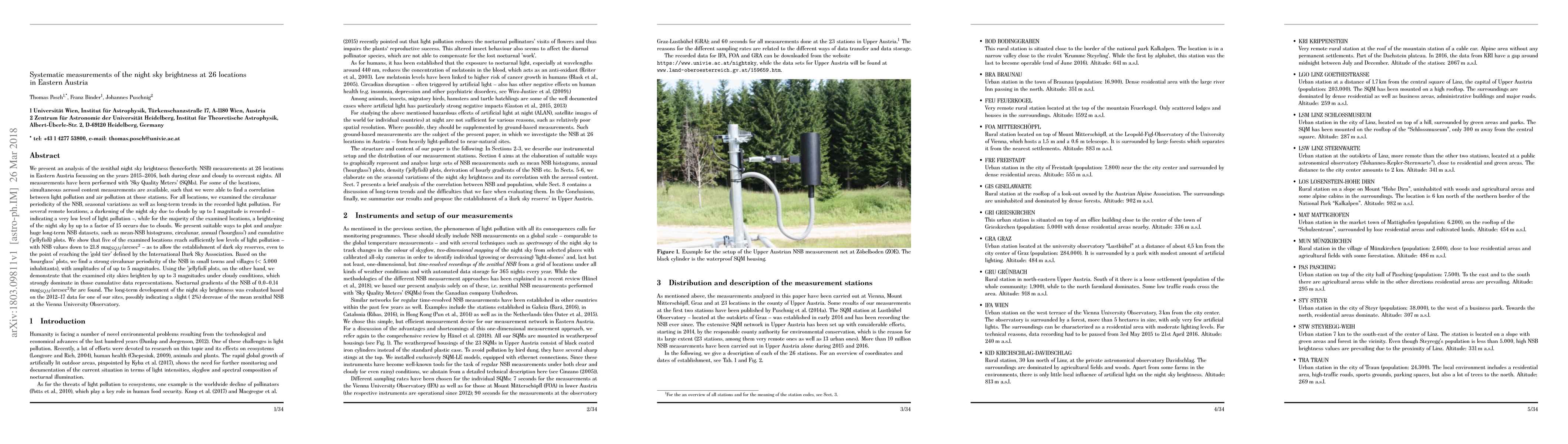 This study systematically measures night sky brightness (NSB) at 26 locations in Eastern Austria from 2015-2016, revealing significant light pollution variations and correlating NSB with aerosol content. The analysis shows a brightening effect due to clouds in most areas, while some remote sites exhibit low light pollution levels suitable for dark sky reserves.