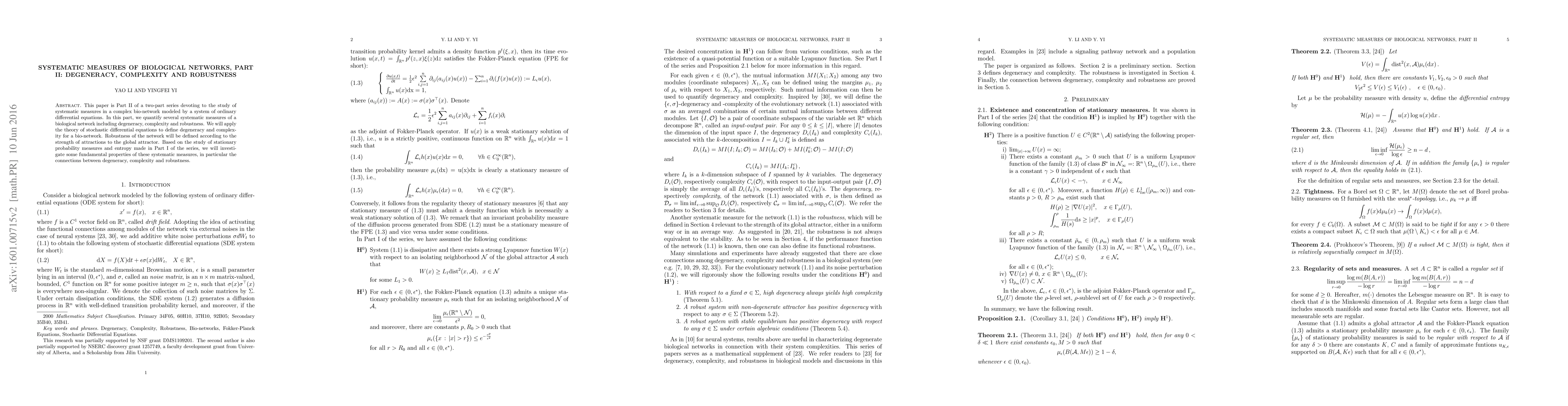 This paper quantifies systematic measures of biological networks, including degeneracy, complexity, and robustness, using stochastic differential equations. It explores the relationships between these measures and defines robustness based on the network's attraction to its global attractor.