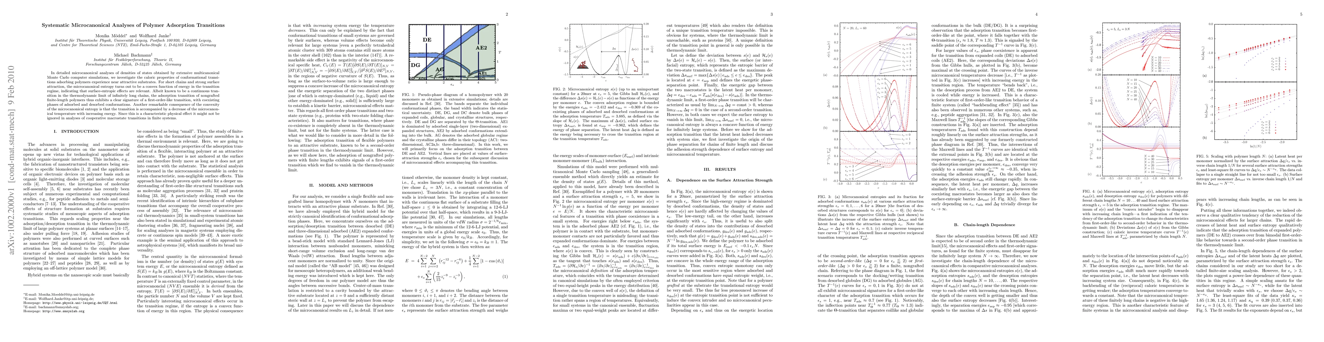 This paper investigates polymer adsorption transitions near attractive substrates using microcanonical analyses and Monte Carlo simulations, revealing a first-order-like transition for finite-length polymers despite a continuous transition in the thermodynamic limit. The study finds that the transition is marked by a decrease in microcanonical temperature with increasing energy, highlighting the importance of surface-entropic effects.