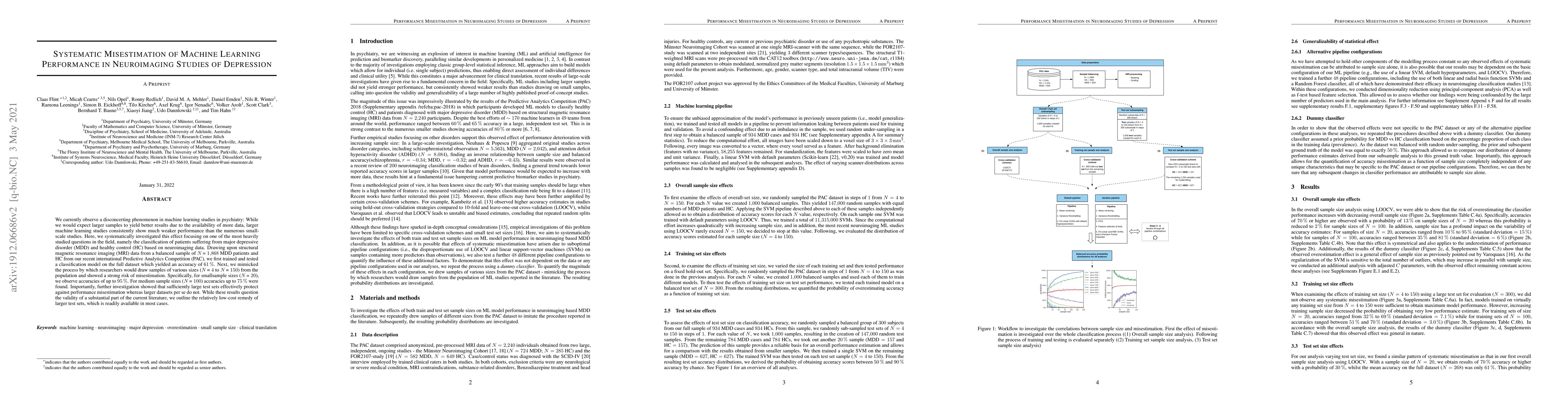 We currently observe a disconcerting phenomenon in machine learning studies in psychiatry: While we would expect larger samples to yield better results due to the availability of more data, larger machine learning studies consistently show much weaker performance than the numerous small-scale studies. Here, we systematically investigated this effect focusing on one of the most heavily studied questions in the field, namely the classification of patients suffering from major depressive disorder (MDD) and healthy control (HC) based on neuroimaging data. Drawing upon structural magnetic resonance imaging (MRI) data from a balanced sample of $N = 1,868$ MDD patients and HC from our recent international Predictive Analytics Competition (PAC), we first trained and tested a classification model on the full dataset which yielded an accuracy of $61\,\%$. Next, we mimicked the process by which researchers would draw samples of various sizes ($N = 4$ to $N = 150$) from the population and showed a strong risk of misestimation. Specifically, for small sample sizes ($N = 20$), we observe accuracies of up to $95\,\%$. For medium sample sizes ($N = 100$) accuracies up to $75\,\%$ were found. Importantly, further investigation showed that sufficiently large test sets effectively protect against performance misestimation whereas larger datasets per se do not. While these results question the validity of a substantial part of the current literature, we outline the relatively low-cost remedy of larger test sets, which is readily available in most cases.