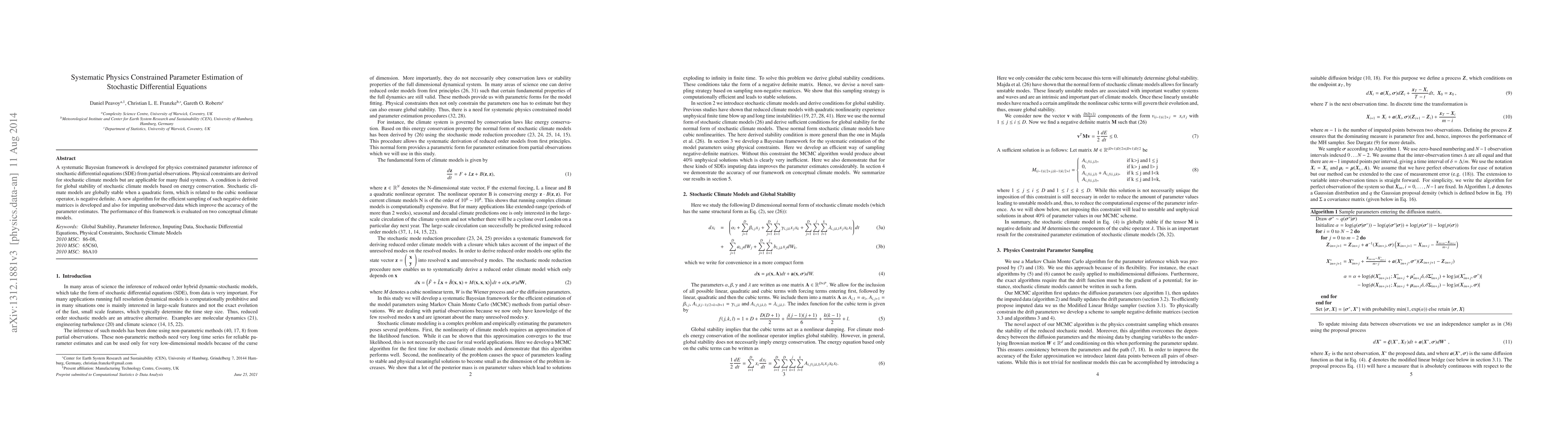 A systematic Bayesian framework is developed for physics constrained parameter inference ofstochastic differential equations (SDE) from partial observations. The physical constraints arederived for stochastic climate models but are applicable for many fluid systems. A condition isderived for global stability of stochastic climate models based on energy conservation. Stochasticclimate models are globally stable when a quadratic form, which is related to the cubic nonlinearoperator, is negative definite. A new algorithm for the efficient sampling of such negative definite matrices is developed and also for imputing unobserved data which improve the accuracy of theparameter estimates. The performance of this framework is evaluated on two conceptual climatemodels.