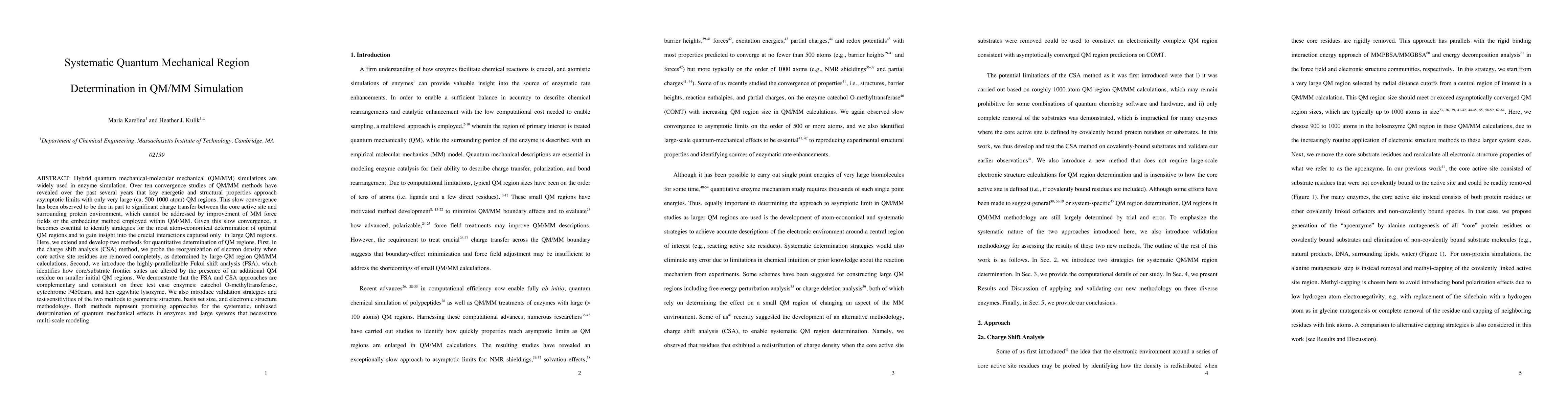 This paper develops two methods—charge shift analysis (CSA) and Fukui shift analysis (FSA)—for determining optimal quantum mechanical (QM) regions in QM/MM simulations of enzymes. These methods aim to identify crucial interactions and improve atom-economical convergence in large QM regions, validated on three enzymes and tested for sensitivity.