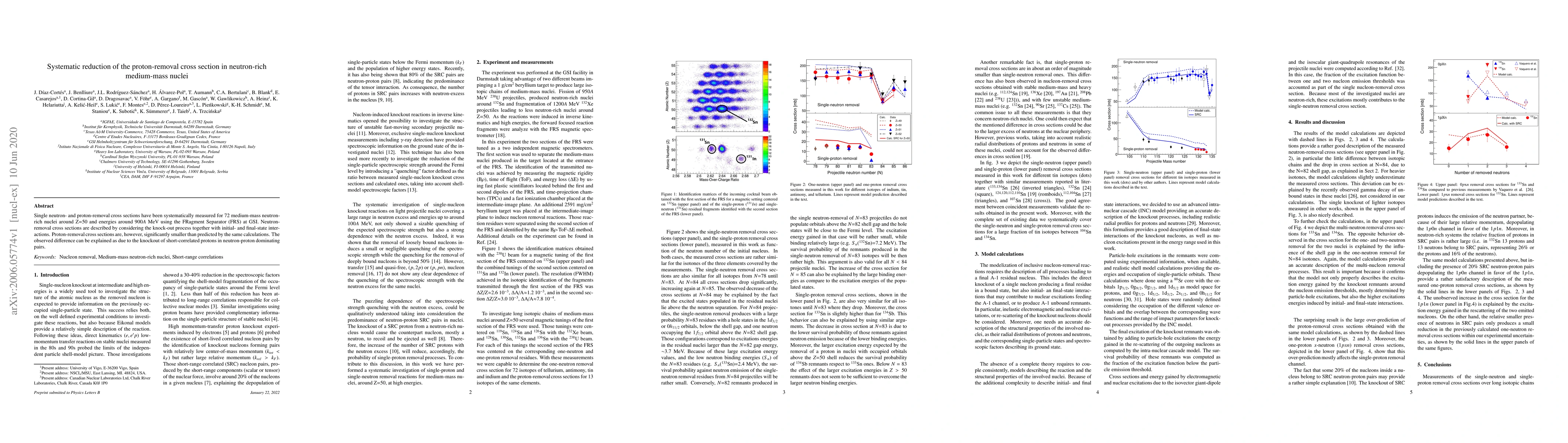 This study systematically measures single neutron- and proton-removal cross sections for 72 neutron-rich medium-mass nuclei around Z=50 at 900A MeV using the FRS at GSI. Proton-removal cross sections are notably lower than predicted, attributed to the knockout of short-correlated protons in neutron-proton pairs.